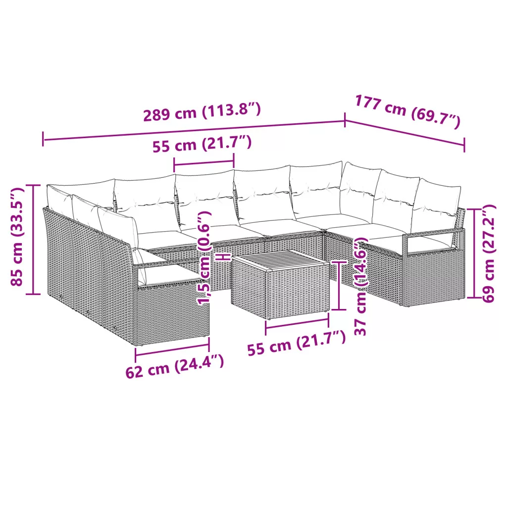 10 Darabos Kerti Kanapé Szett Párnával Fekete Polirattan Akác