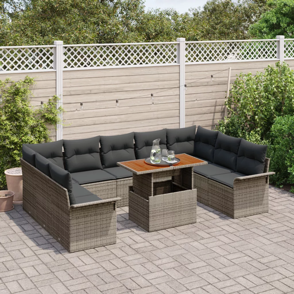 10 darabos kertibútor étkező szett párnákkal, szürke poli rattan, akác