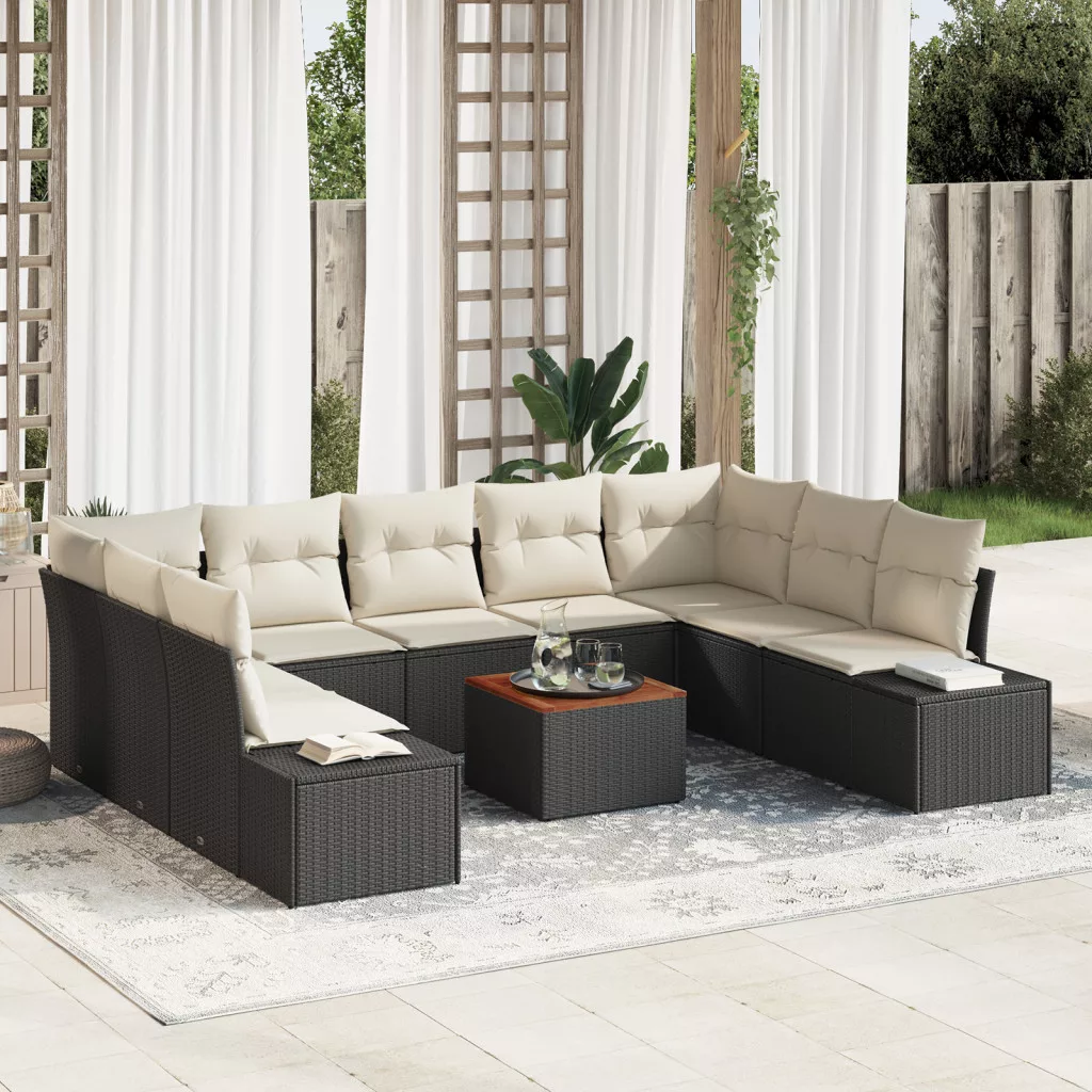 10 darabos kertibútor szett párnákkal, fekete polirattan, akác