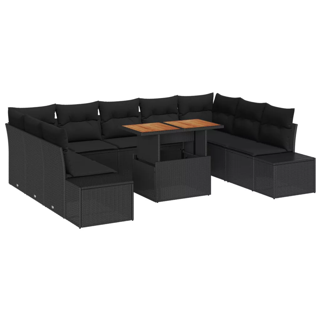 10 darabos kültéri étkezőkészlet párnákkal, fekete polyrattan akáccal
