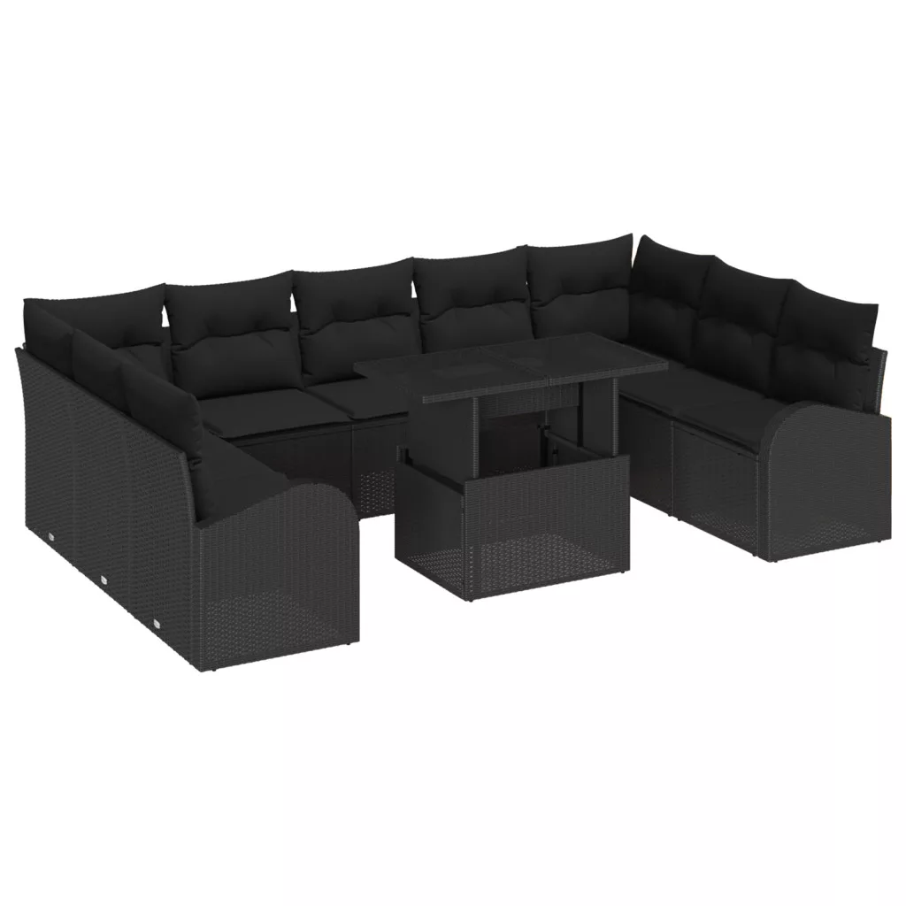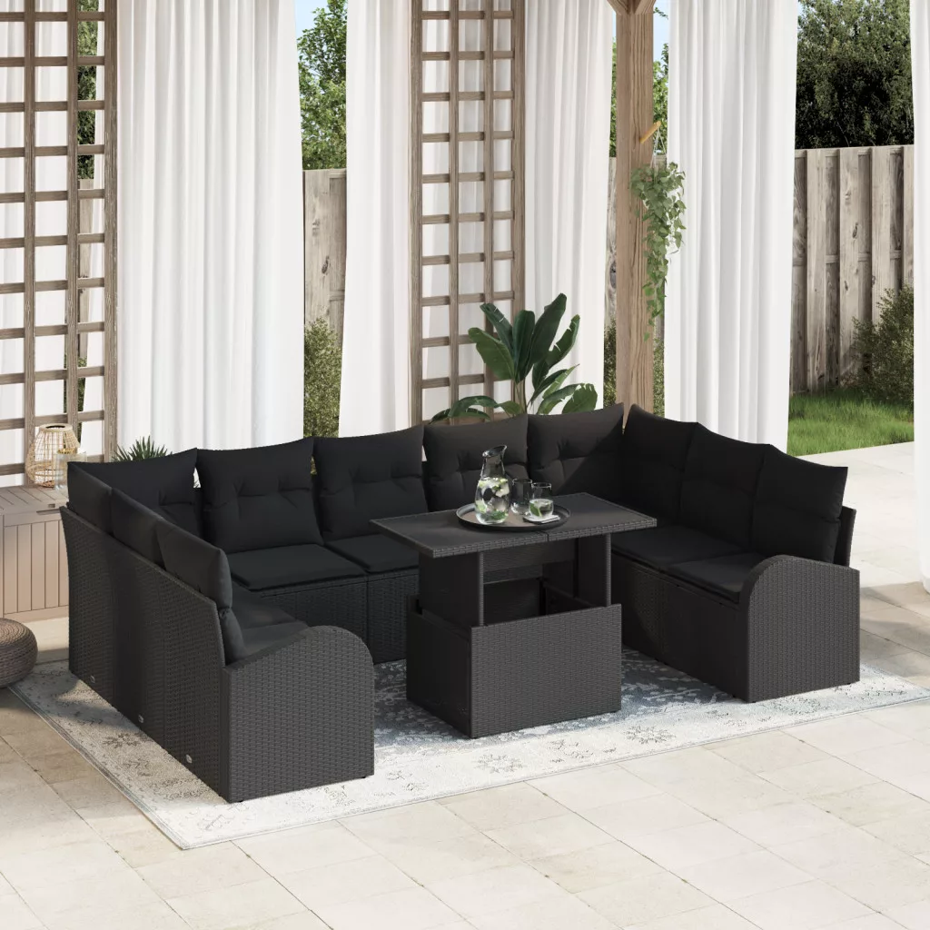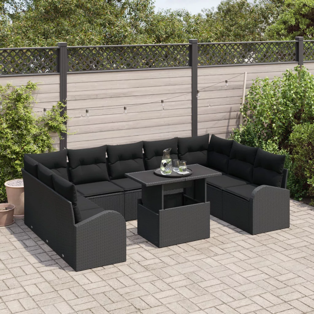 10 részes Kert Kanapé Szett Párnákkal Fekete Polirattan