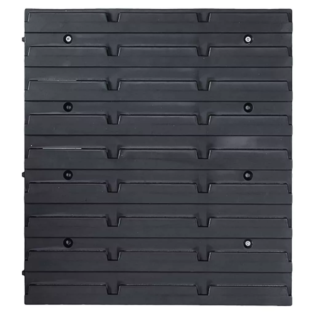 Tartson rendet garázsában, műhelyében vagy alkotóműhelyében ezzel a falra erősíthető tárolókészlettel. A rakásolható dobozokkal rendelkező praktikus állvány számos tárolási lehetőséget kínál apró tárgyak, például csavarok, szögek, anyák, aljzatok, szerelvények stb. számára. A 6 tömör fali panelen különböző rögzítő tartozékok és 27 doboz helyezhető el, amelyek az apró alkatrészek könnyebb áttekintése érdekében felcímkézhetőek. A tárolódobozokat egyenként veheti ki, és egymásra rakhatja őket. A növelhető méretű tárolószett könnyen felszerelhető a garázs vagy műhely falára. A tárolódoboz-készlet flexibilitásának köszönhetően minden igényét kielégíti.