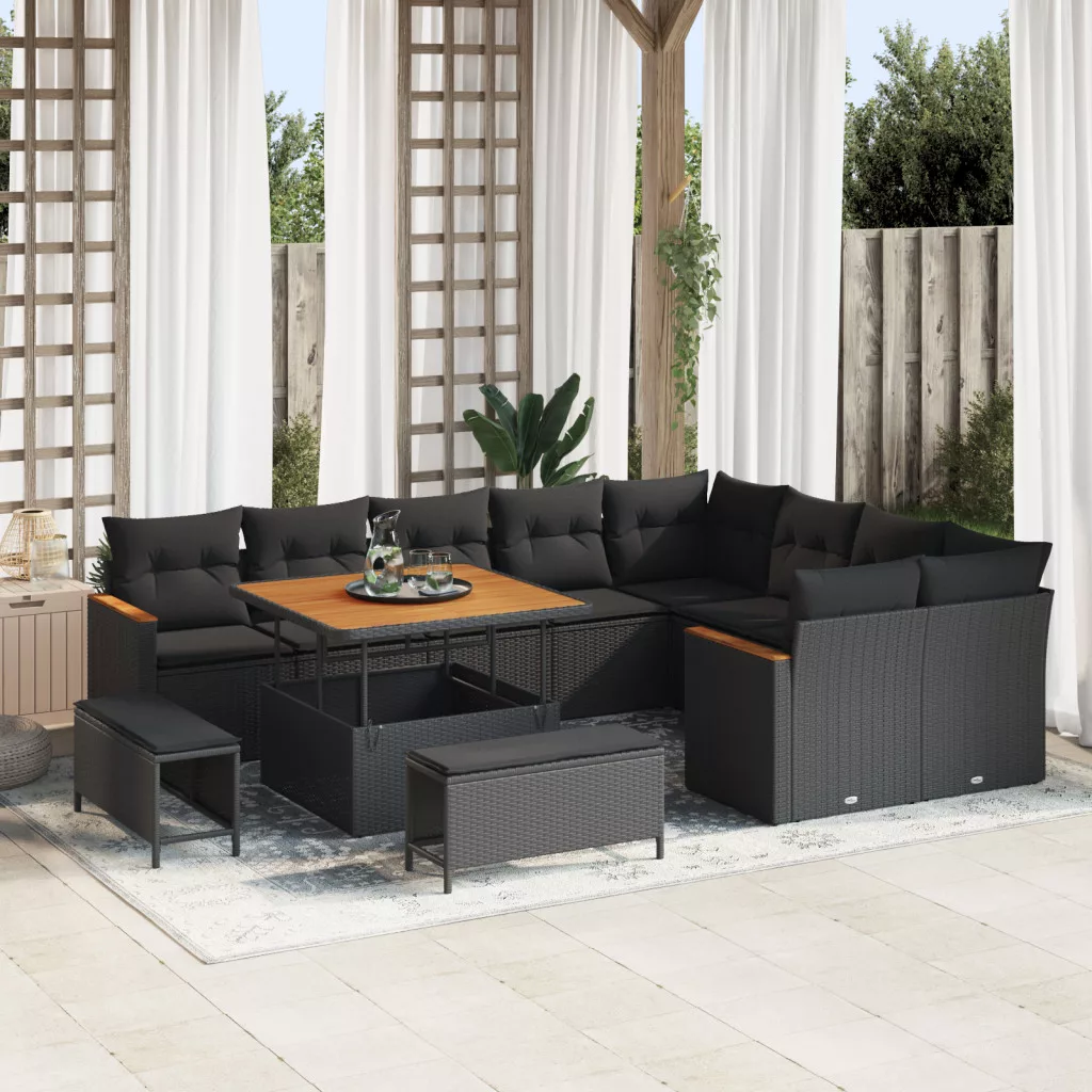 12 darabos kerti sofa szett párnákkal fekete poli rattan akácfa