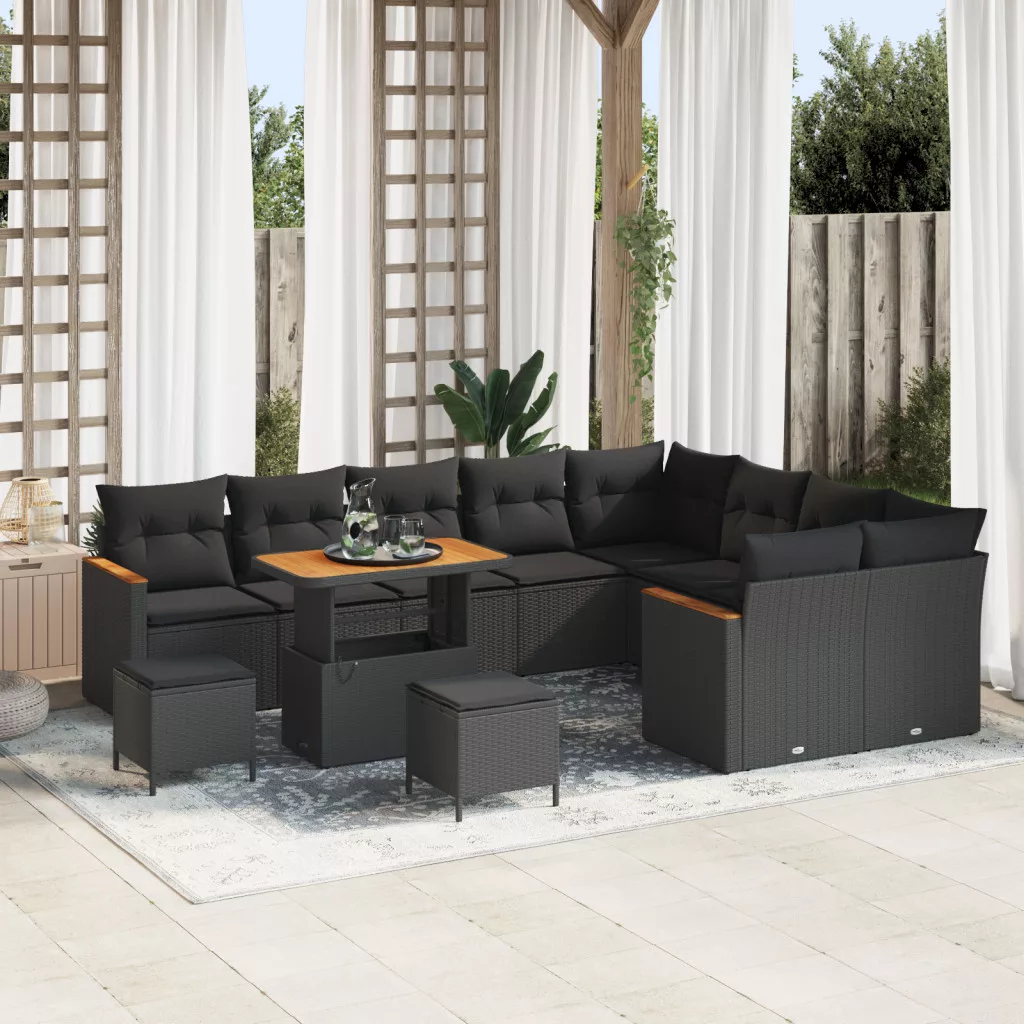 12 részes kertiszófakészlet párnákkal fekete polirattan akác