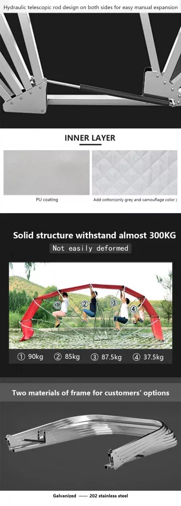 Thanks to its accordion-style structure, it can be easily folded and unfolded in a single motion.- Roof load capacity (e.g. snow load): up to 300 kg- Frame material: 202 stainless steel- Color: grey- Wind resistance level: 7- Cover material: 600D Oxford fabric, water-repellent and flame-retardant.