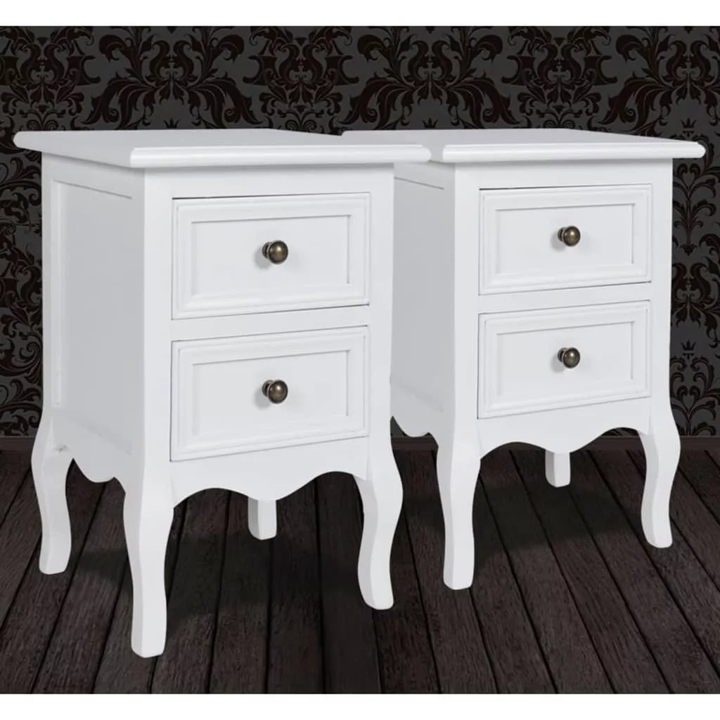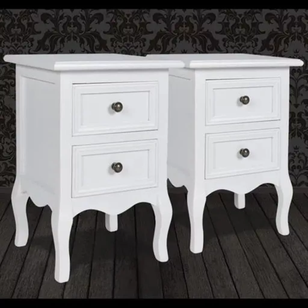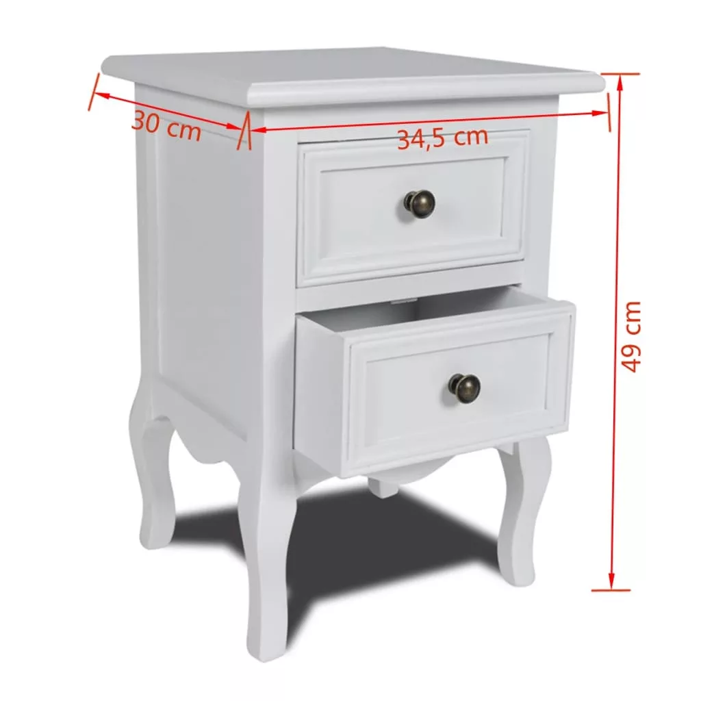 Ez a két antik stílusú éjjeliszekrény nagyméretű fiókokkal lett felszerelve, így mindig elérhető közelségben tarthatja ágy mellett szükséges holmijait.Mindegyik éjjeliszekrény két fiókkal lett felszerelve. Tiszta, lakkozott, valódi fa fiókjainak köszönhetően még elegánsabb ez az éjjeliszekrény. Kúp alakú lábakkal és csiszolt krómgombokkal lett ellátva. Strapabíró fehér MDF burkolatot kapott. A csomag 2 db éjjeliszekrényt tartalmaz kartondobozba csomagolva. Figyelem, a bútor kézzel készült fából és fehérre lett festve, így apróbb tökéletlenségek előfordulhatnak rajta.