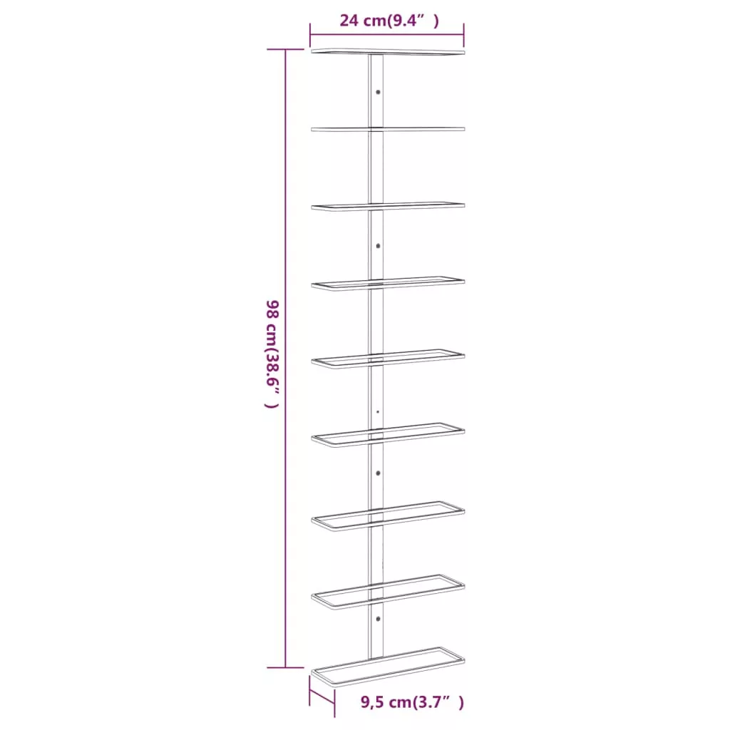 Ez a falra szerelhető borállvány kényelmesen használható, és tökéletes választás kedvenc borai rendezésére és tárolására. Maximum 9 db borospalack tárolására alkalmas. Modern dizájn: Ez a bortartó állvány divatos kiegészítője lesz modern konyháknak, kamráknak és bároknak.Kiváló minőség: A palacktartó szóróbevonatos vasból készült, így rendkívül tartós és könnyen karbantartható! Ezenkívül nagyon sima a felülete, ezért nem karcolja össze a palackokat.Könnyű összeszerelés: A szeszesital-állvány a mellékelt szerelvényekkel könnyen falhoz erősíthető.
