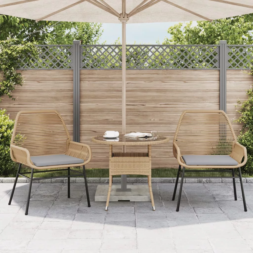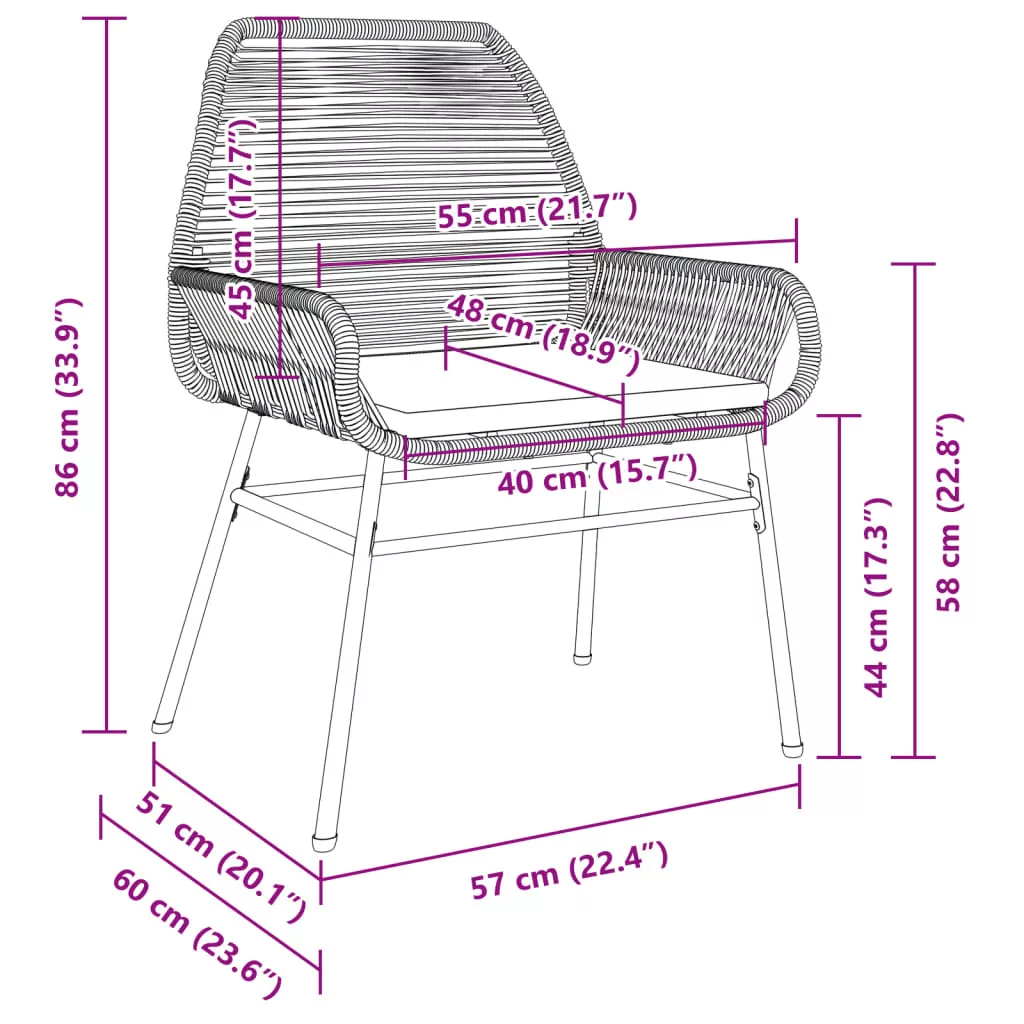 Pihenjen és élvezze a szabad levegőt ezeken a kényelmes kerti székeken! Tartós anyag: A PE rattan, más néven polyrattan, egy erős, kevés karbantartást igénylő szintetikus anyag, amely úgy néz ki, mint a természetes rattan. Könnyű, könnyen tisztítható, tartóssága és időjárásálló tulajdonságai miatt gyakran használják kültéri bútorok készítéséhez.Kényelmes ülőélmény: Ez a vastagon bélelt párnákkal kiegészített kültéri bútor kényelmes ülőélményt kínál. A háttámlával és alacsony karfákkal rendelkező kerti szék a lehető legnagyobb kényelmet nyújtja.Robusztus és stabil váz: A porszórt acél váz biztosítja, hogy a kerti bútor erős és stabil legyen a mindennapi kültéri használathoz. Jó tudni:A kültéri bútor szépségének megőrzése érdekében javasoljuk, hogy vízálló huzattal fedje be. Maximum 110 kg ülésenként. Ügyeljen a nyílt tűz és más erős hőforrások veszélyére a termék közelében.