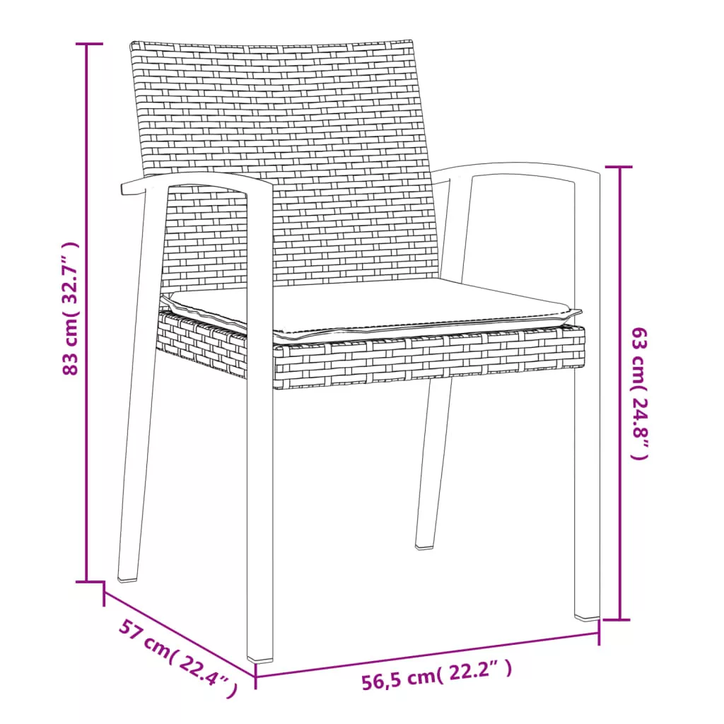Ezek a stílusos kerti székek kertje és terasza ideális kiegészítői lesznek, és maradandó benyomást keltenek! Tartós anyag: A PE-rattan, más néven polyrattan, időjárásálló és könnyen tisztítható. Sokáig megőrzi szépségét a szabadban. Kiváló minőséget, kényelmet és esztétikus megjelenést garantál.Erős váz: Az acélváz masszívvá és stabillá teszi a kerti ülőalkalmatosságot a mindennapos kültéri használathoz.Kényelmes ülés: A háttámla és a karfák extra kényelmet biztosítanak a kültéri szék számára. Ráadásul a vastagon bélelt párna is kényelmet nyújt ülés közben. Megjegyzés:A kültéri bútor szépségének megőrzése érdekében javasoljuk, hogy vízálló huzattal fedje be. Maximum 110 kg ülésenként. Ügyeljen a nyílt tűz és más erős hőforrások veszélyére a termék közelében.