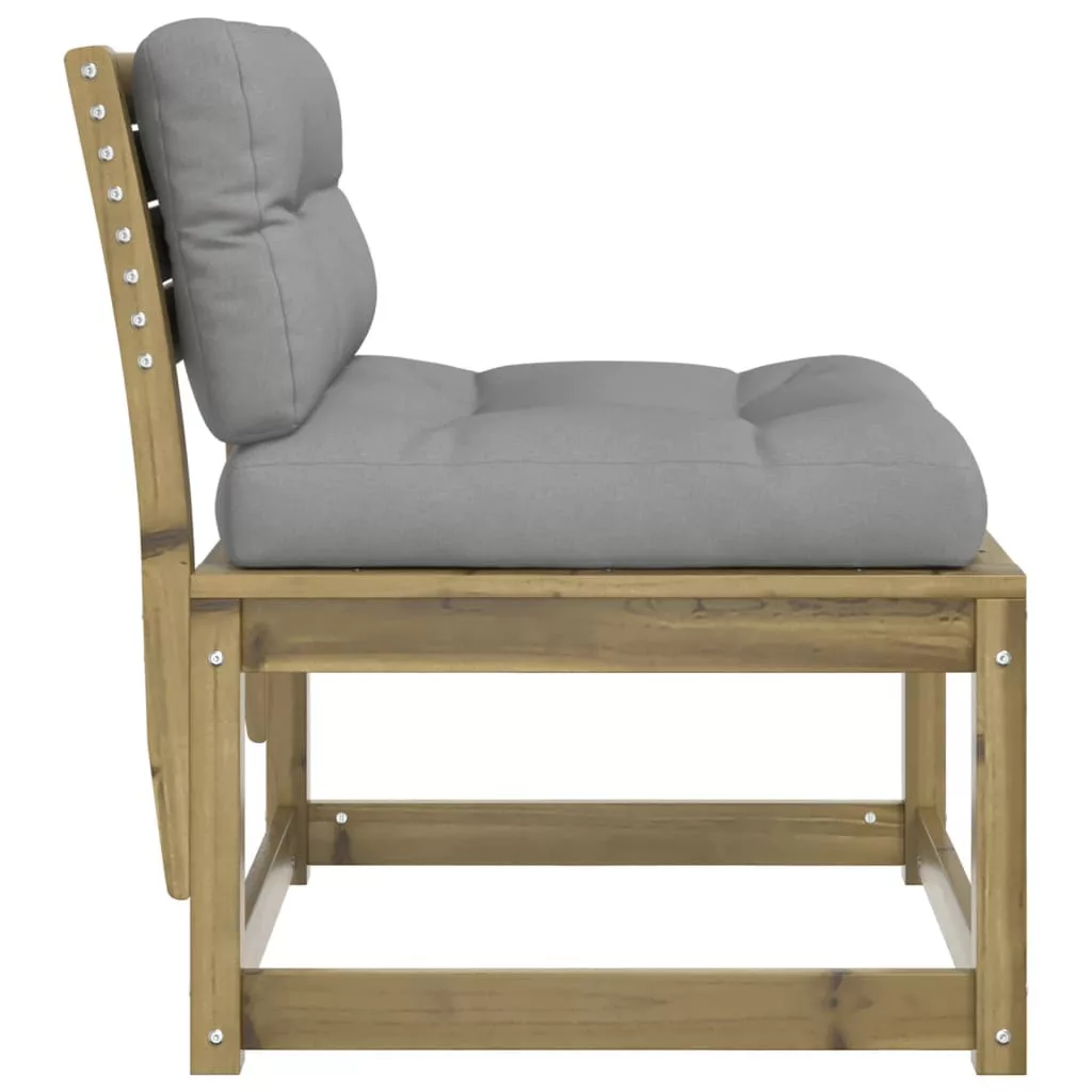 Ezek a fából készült, párnás kerti kanapék remek kiegészítői lesznek kertjének, teraszának vagy udvarának, ha családjával és barátaival beszélgetne, vagy csak élvezné az időjárást. Impregnált fenyőfa: A tömör fenyőfa egy gyönyörű és természetes anyag. A fenyőfa egyenes erezetű, a csomók pedig jellegzetes, rusztikus megjelenést biztosítanak az anyagnak. Az impregnálás egy tartósítási eljárás, amely egy zárt, túlnyomásos berendezés használatával történik. A nyomáskezelés növeli a korhadással és a vízzel szembeni ellenállást.Kényelmes ülőélmény: A háttámla és a párnák kényelmesebbé teszik a kerti kanapészéken való ülést.Rácsos kialakítás: A kültéri kanapé rácsos kialakítása megakadályozza a víz felgyülemlését, szárazon tartja az ülést és megakadályozza a szükségtelen korhadást.Moduláris felépítés: Ez az egyszemélyes kanapé moduláris felépítésű, így teljesen rugalmas és könnyen mozgatható, hogy bármilyen környezethez illeszkedjen. Kombinálhatja a legördülő menüben található más elemes egységekkel, és létrehozhatja saját személyes kerti társalgóját! Jó tudni:A kültéri bútor szépségének megőrzése érdekében javasoljuk, hogy vízálló huzattal fedje be. Maximum 110 kg ülésenként.