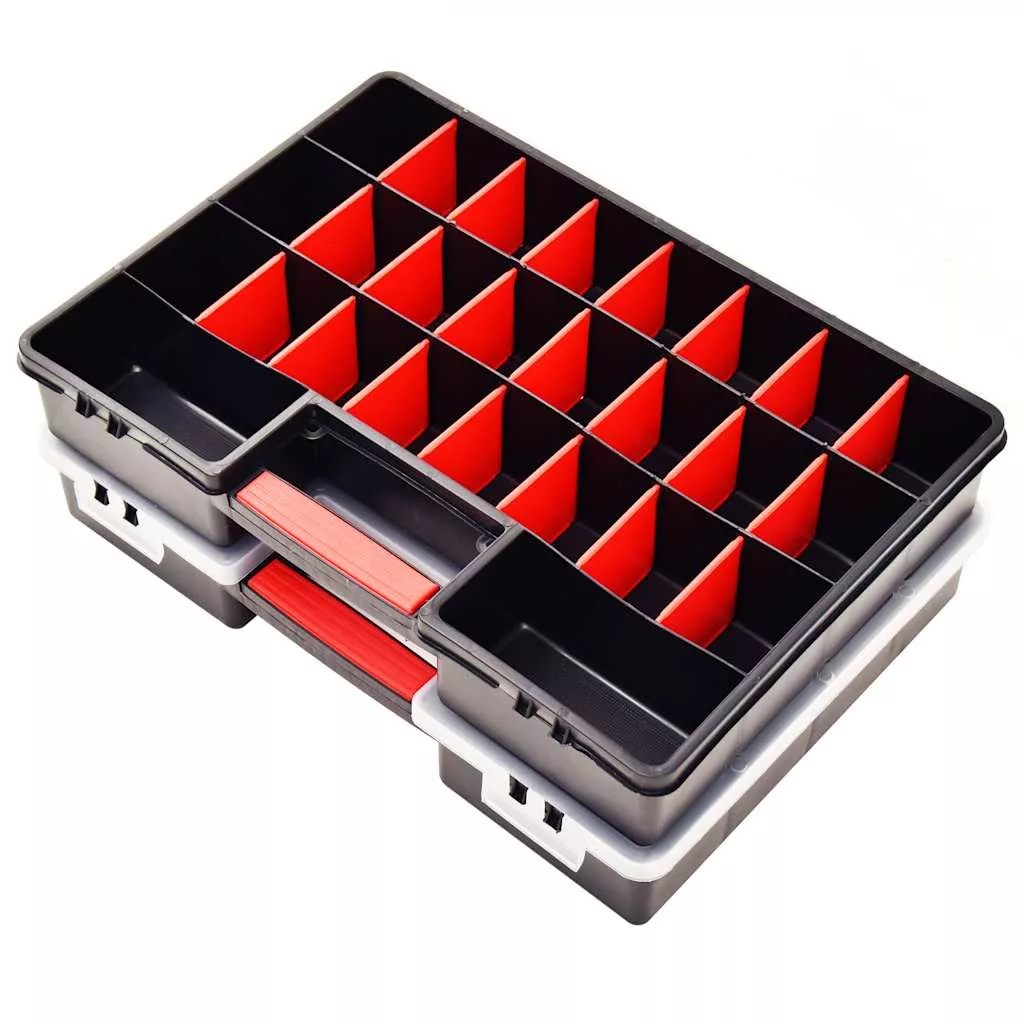 Ez az állítható elválasztókkal rendelkező tárolódoboz praktikus segítség lesz garázsában, műhelyében vagy máshol! Ez a praktikus szerszámszervező kiváló javaslat lesz azoknak, akik értékelik a rendet és a rendet a barkácsolás és a kézműveskedés során, de a munkahelyi szakembereknek is. Az átlátszó borításnak köszönhetően könnyen felismerheti és megtalálhatja a csavarokat, anyákat, szögeket és egyéb apró alkatrészeket. A 21 állítható elválasztóelemmel ellátott választéktáska akár 26 rekeszre is felosztható, így biztosítva, hogy minden megtalálja a helyét. A felhasználóbarát fogantyú lehetővé teszi a tartalom hordozását.