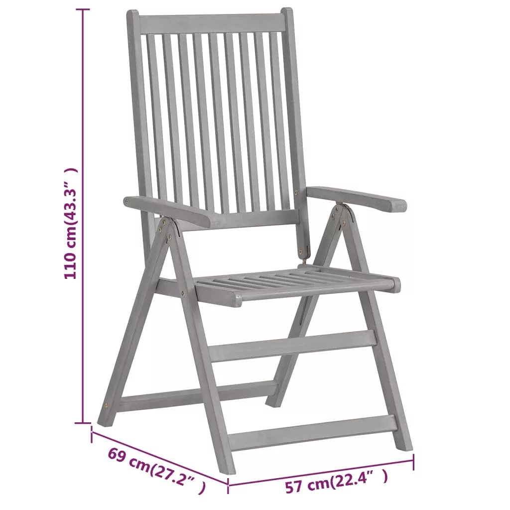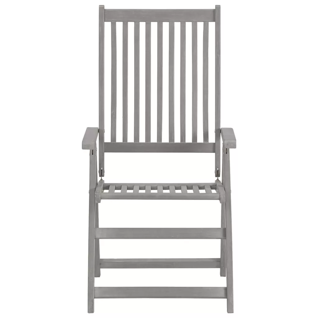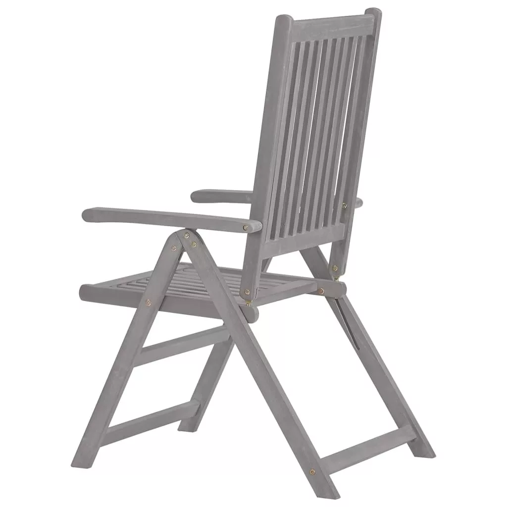 Fokozza kültere kényelmét ezzel az elegáns, rusztikus ihletésű kerti székszettel! Ideális arra, hogy családtagjaival és barátaival csevegjen, vagy egyszerűen csak élvezze a jó időt. A tömör akácfából készült és szürke antikolt felületkezelést kapott széket különféle pozíciókba lehet állítani. Ellenáll az UV-sugaraknak és az időjárási viszontagságoknak, ezért hosszú évekig használható. A szék háttámlája 5 különböző pozícióba dönthető, így mindig megtalálhatja a legkényelmesebb helyzetet. Könnyű szerkezete megkönnyíti a szék mozgatását. A helytakarékosság érdekében a szék használaton kívül összecsukható. A szett 2 db összecsukható kerti széket tartalmaz Maximum 110 kg ülésenként.