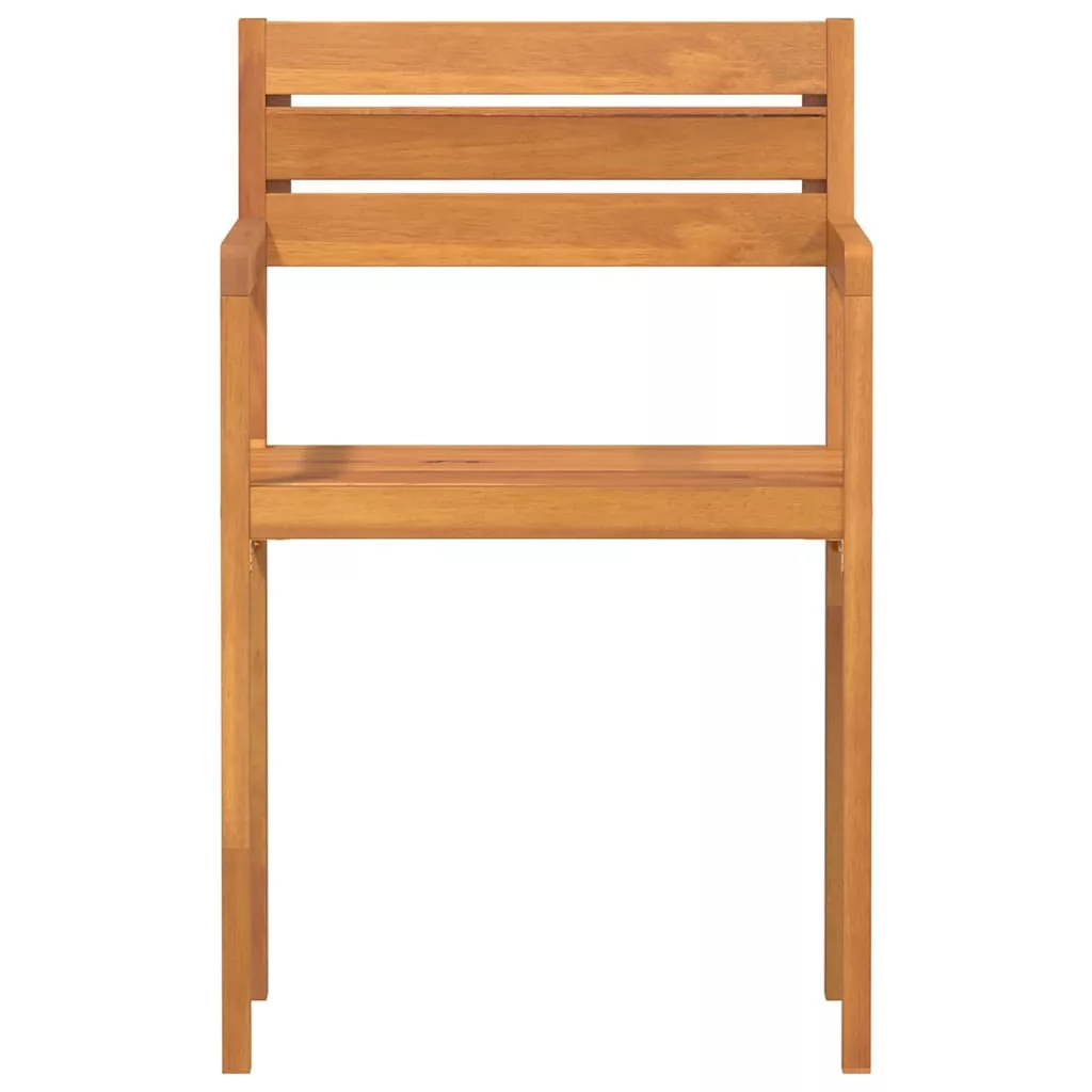 Ezek a fa kerti székek nagyszerű kiegészítői lesznek kertjének, teraszának vagy verandájának. Robusztus és stabil anyag: A tömör akácfa szilárdságáról és tartósságáról ismert, amelyet egyedi erezetminták egészítenek ki, amelyek fokozzák vizuális vonzerejét. A védőolajréteggel kezelt asztal kültéri használatra készült, ellenáll az elemeknek, miközben megőrzi gyönyörű fa erezetét.Praktikus háttámla és karfa: Ez a kerti szék egy háttámlával és két karfával rendelkezik, amelyek optimális tartást és kényelmet biztosítanak a felhasználóknak.Jól szellőző és tócsaképződés elleni védelem: A léces kialakítás optimális légáramlást biztosít, és hatékonyan megakadályozza a víz tócsásodását, biztosítva a száraz és kényelmes ülést.Könnyen tisztítható felület: Az olajozott felületnek köszönhetően ezek a kerti étkezőszékek könnyen tisztíthatók nedves ruhával. Jó tudni:Annak érdekében, hogy kültéri bútorai szépek maradjanak, javasoljuk, hogy vízálló huzattal takarja le őket.