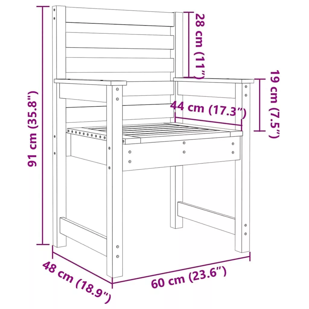 Ezek a fából készült kerti székek kiválóan alkalmasak étkezéshez, olvasáshoz és pihenéshez családja vagy barátai körében. Tömör fenyőfa: Ezek a teraszszékek tömör fenyőfából készültek. A tömör fenyőfa egy gyönyörű, természetes anyag. A fenyőfa egyenes erezetű, a csomók pedig jellegzetes, rusztikus megjelenést biztosítanak az anyagnak.Stabil faváz: A kültéri szék faváza biztosítja szilárdságot és stabilitást biztosít.Praktikus kialakítás: A széket elhelyezheti a kertben vagy a teraszon, hogy így élvezze az olvasást egy csésze kávé mellett. Megjegyzés:Kerti bútora élettartamának meghosszabbítása érdekében javasoljuk, hogy védje vízálló takaróval. Jó tudni:A szerelés megkönnyítése érdekében minden termék kézikönyvvel együtt kerül kiszállításra. Maximum 110 kg ülésenként.