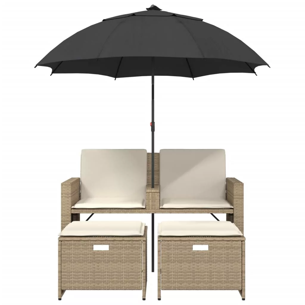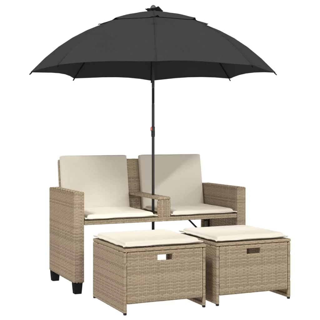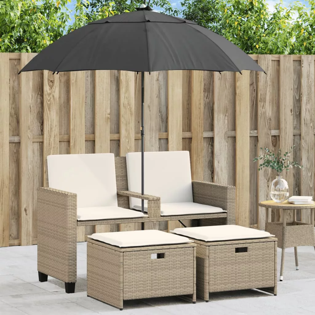 2 személyes bézs polyrattan kerti kanapé napernyővel/székkel