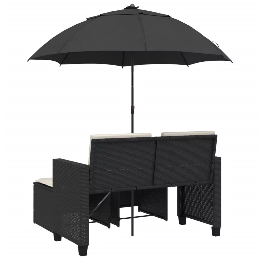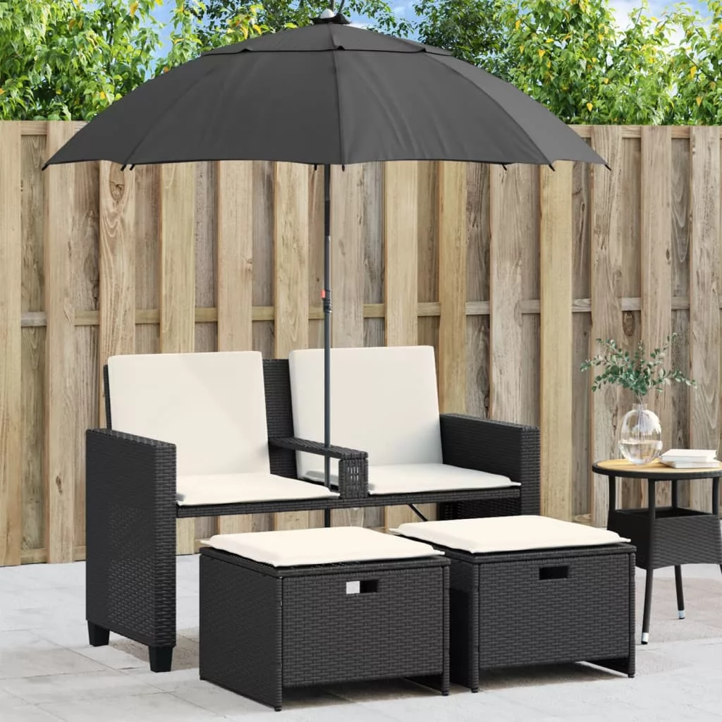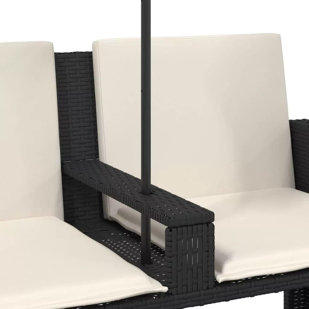 2 személyes fekete polyrattan kerti kanapé napernyővel/székkel