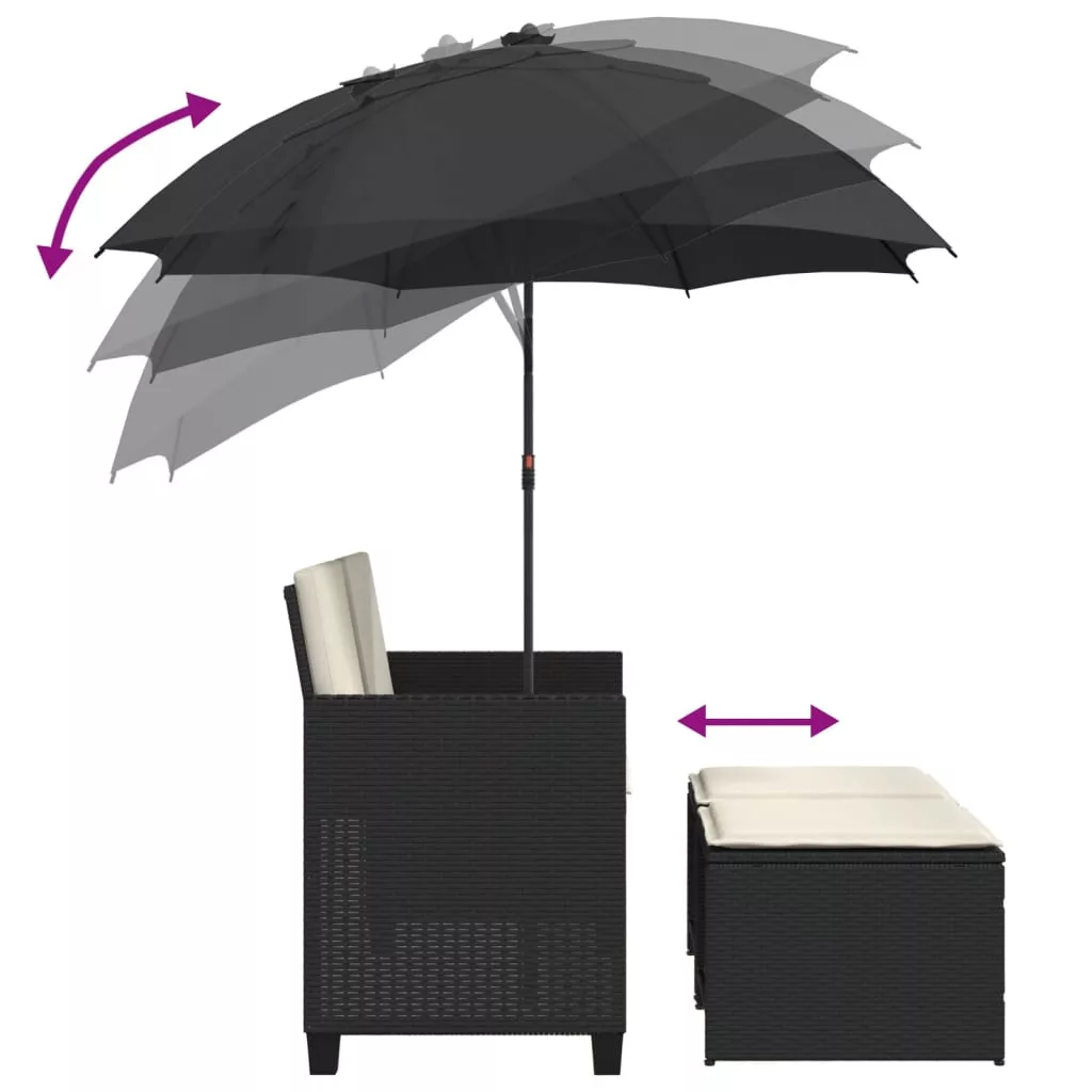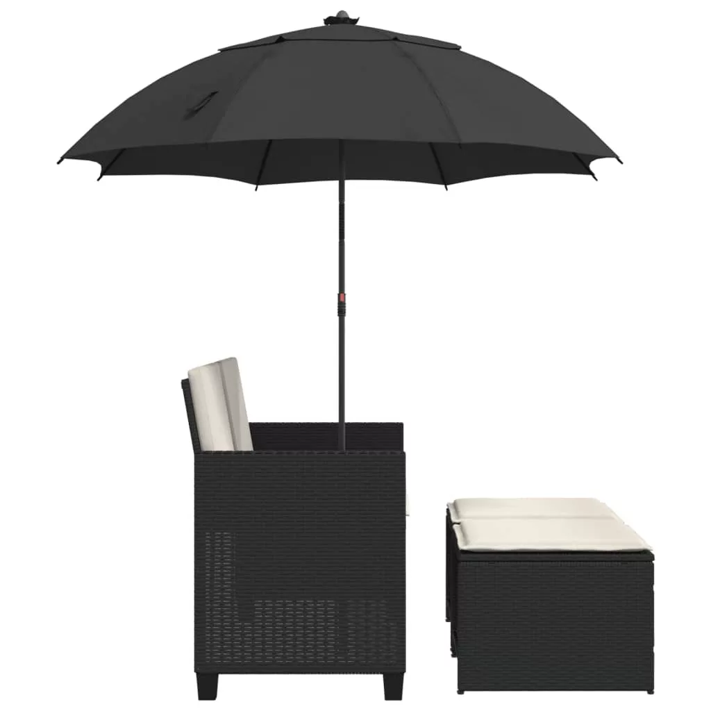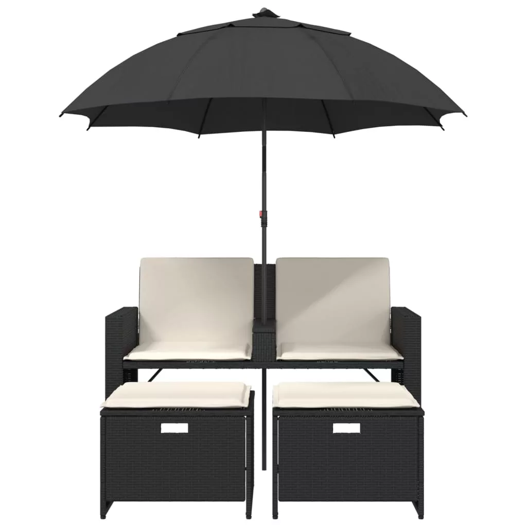 2 személyes fekete polyrattan kerti kanapé napernyővel/székkel