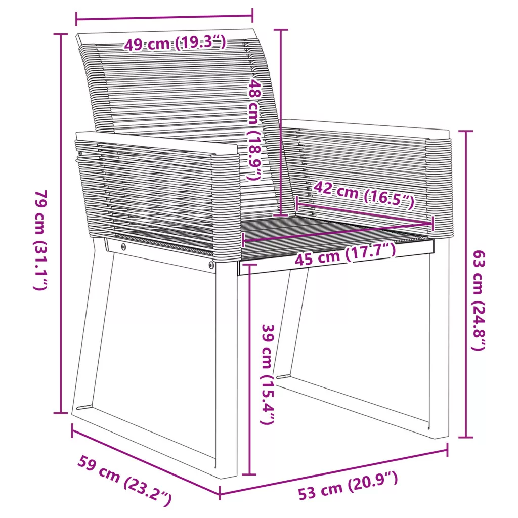Ez a kerti székszett fekete polirattanból készült, elegáns és praktikus megjelenést ad a kültéri területeknek. Modern dizájnjával remekül illik a különböző környezetekhez, ideális kültéri étkezésekhez a teraszon vagy barátokkal való lazításhoz az erkélyen. Tartós anyag: Ezek a székek tartós PE rattanból készültek, ami nemcsak természetes rattan kinézetet ad, hanem bírja a napi kültéri igénybevételt is. Robosztus keret: A porfestett acélkeret hosszú távú stabilitást és tartósságot nyújt, így nagyszerűek kültéri szórakozáshoz. Kényelmes kialakítás: Támogató háttámlával és alacsony kartámlákkal rendelkeznek, nagyszerű kényelmet biztosítanak, lehetővé téve a pihenést és lazítást. Könnyűsúlyú: Minden szék könnyű, így rendkívül egyszerű őket mozgatni, akár újrarendezni szeretnéd a teret, akár a legjobb helyeket keresed a kertedben. Stílusos megjelenés: Letisztult fekete dizájn, ezek a székek feldobják a kültéri dekorációdat, miközben élményekre és jó beszélgetésekre csábítanak. Maximum 110 kg ülésenként.