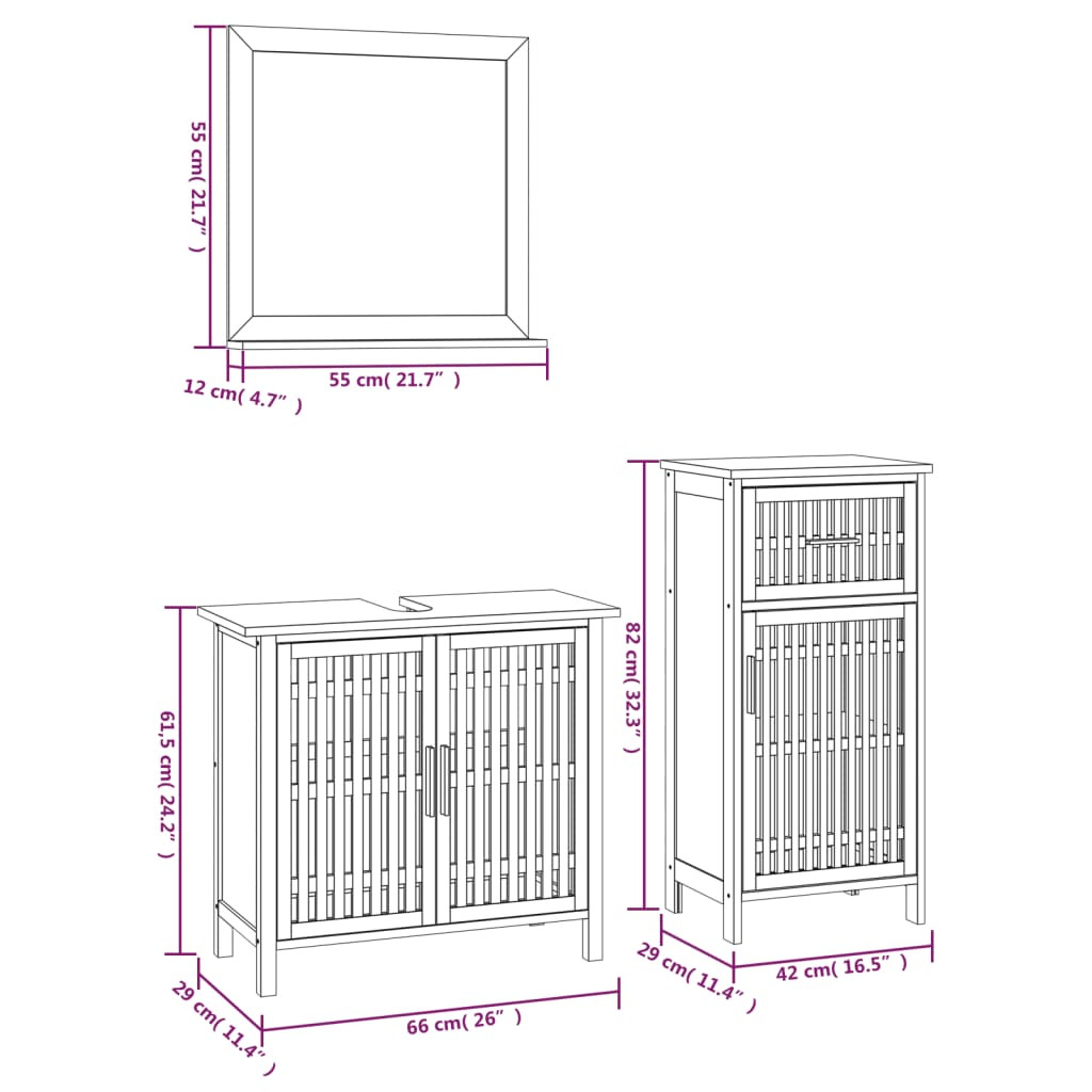 Vigyen egy csipetnyi elegáns bájt fürdőszobájába ezzel a fürdőszobabútor-garnitúrával! Tömör diófa: A tömör diófa sűrű és robusztus fa, mely rendkívül ellenálló a kopással szemben, valamint jellegzetes színéről és vonzó erezetmintájáról híres.Bőséges tárolóhely: A fürdőszobai tárolókészlet bőséges tárolóhelyet kínál a fürdőszobai kellékek rendszerezéséhez.Kiváló szellőzés: A fürdőszobai szekrények ajtaja és fiókja rácsos kialakítású, ami optimális szellőzést garantál.Tiszta kép: Az üveg tükörfelület tiszta képet biztosít. Így gyönyörűen és természetesen láthatja magát, amikor előtte áll.Praktikus kialakítás: A fürdőszobai mosdószekrény teteje ideális a mosdókagyló elhelyezésére. Jó tudni:A szerelés megkönnyítése érdekében minden termék kézikönyvvel együtt kerül kiszállításra.A falon belüli csavarok és dugók nem alaptartozékok. Azt tanácsoljuk, hogy keressen és használjon kifejezetten az Ön falához megfelelő csavarokat és dugókat. Ha nem biztos benne, konzultálhat egy szakemberrel. Kérjük, olvassa el és kövesse az utasítások minden lépését. Figyelem:A felborulás elkerülése érdekében ezt a terméket a mellékelt fali rögzítőeszközzel kell használni.