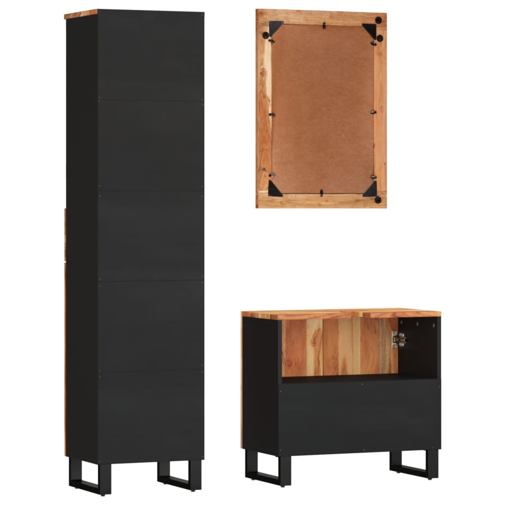 Ez a tágas tárolóhellyel rendelkező, praktikus fürdőszobaszekrény-garnitúra fürdőszobája nagyszerű kiegészítője lesz, rendezett és lenyűgöző megjelenést kölcsönözve neki! Tömör akácfa: A szekrény tömör akácfából és szerelt fából készült. A tömör akácfa egy gyönyörű, természetes anyag. Az akácfa egy trópusi keményfa, amely sűrű erezetű, masszív és tartós.Bőséges tárolóhely: A fürdőszobai tárolószekrény különféle tárolási lehetőségeket és tágas helyet kínál a fürdőszobában lévő tárgyak tárolására.Stabil lábak: A fürdőszobaszekrény vaslábai szilárdságot és stabilitást biztosítanak.Praktikus kialakítás: A fürdőszobai mosdószekrény teteje ideális a mosdókagyló elhelyezésére.Tiszta kép: Az üveg tükörfelület tiszta képet biztosít. Így gyönyörűen és természetesen láthatja magát, amikor előtte áll. Figyelem:A felborulás elkerülése érdekében ezt a terméket a mellékelt fali rögzítőeszközzel kell használni.Jó tudni:A szállítás a mosdót nem tartalmazza.A falon belüli csavarok és dugók nem alaptartozékok. Azt tanácsoljuk, hogy keressen és használjon kifejezetten az Ön falához megfelelő csavarokat és dugókat. Ha nem biztos benne, konzultálhat egy szakemberrel. Kérjük, olvassa el és kövesse az utasítások minden lépését.Minden termék egyedi, a szín és az erezet változik. A kiszállítás véletlenszerűen történik, biztosítva terméke exkluzivitását és egyediségét. Ne használja ezt az elemet, ha valamelyik alkatrésze eltört, elszakadt vagy hiányzik.