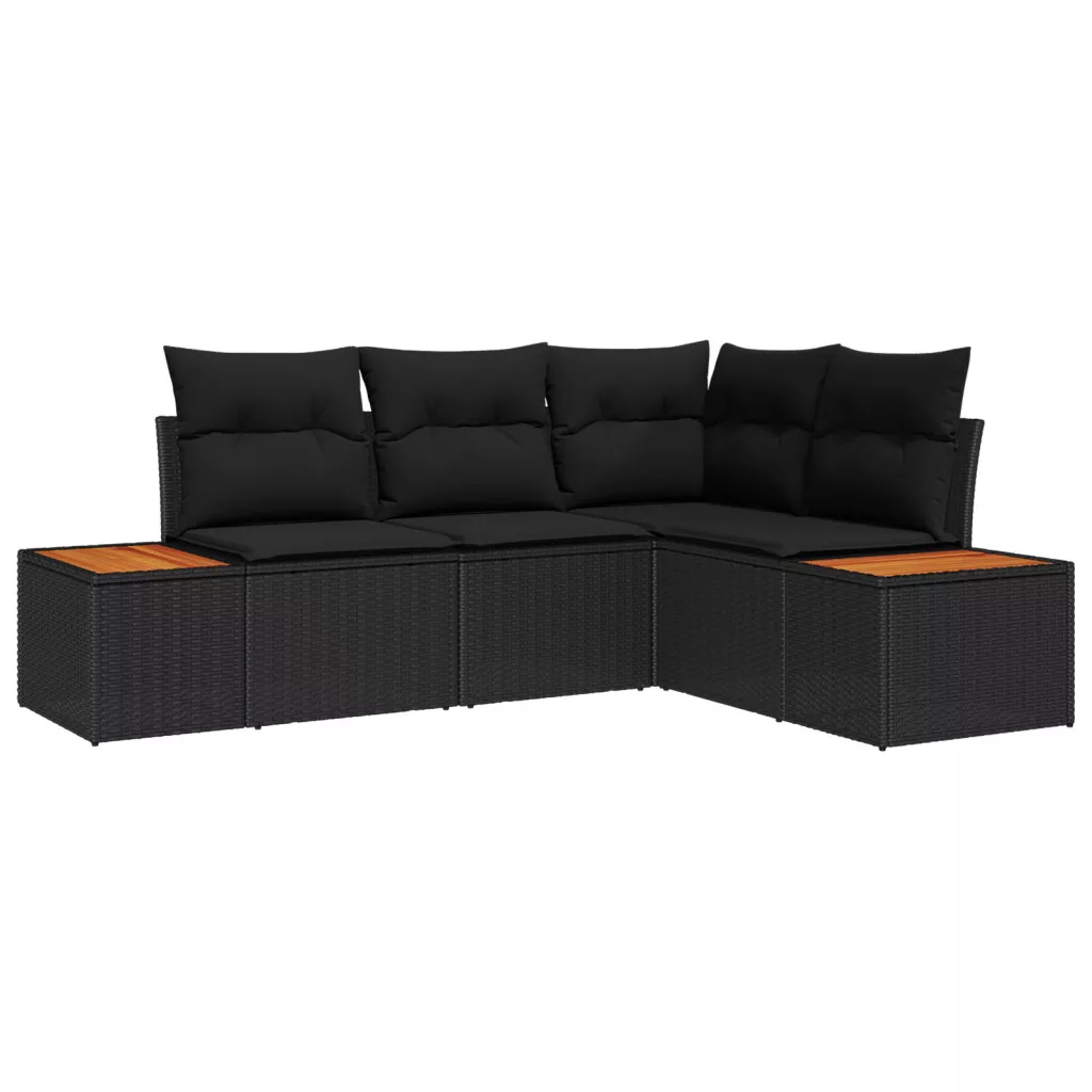 4 Részes Kert Kanapé Szett Párnákkal Fekete Polirattan Akácia