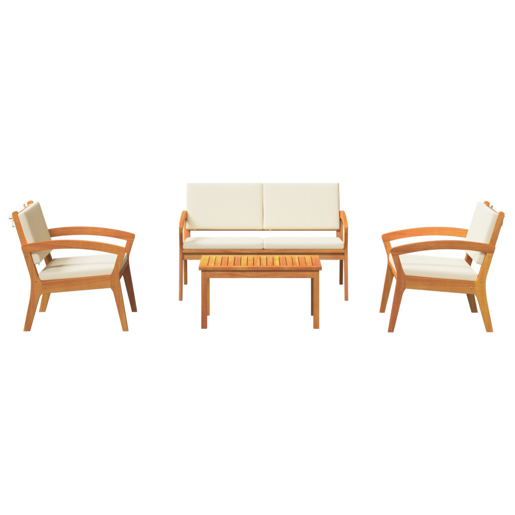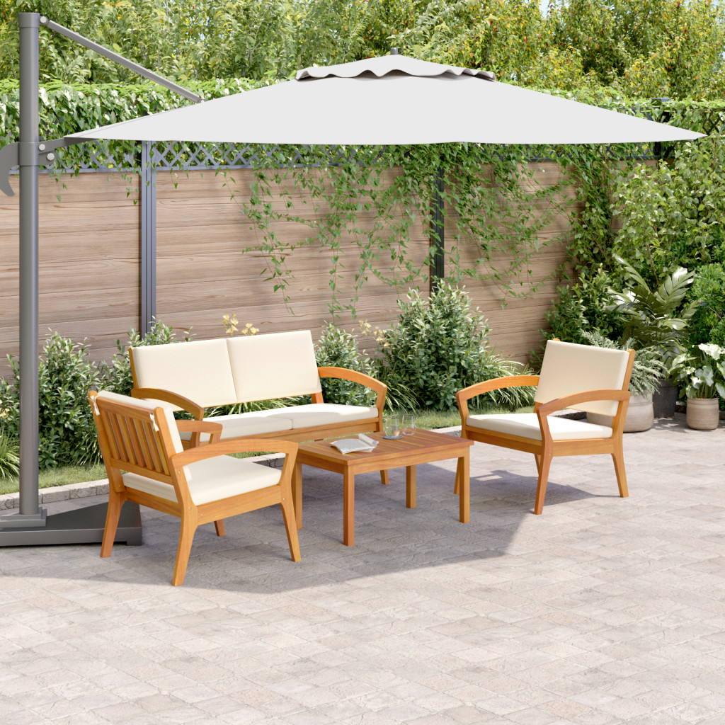 Ez az ívelt kültéri kanapé szett klassz választás a lakóterek feldobására. Tökéletes kültéri hangulathoz ötvözi a stílust és a funkciót. Két elegánsan ívelt székből és egy téglalap alakú kávézó asztalból áll, így egy kényelmes helyet teremt, ahol barátokkal találkozhatsz vagy csak lazíthatsz, mindez szép krém színben, ami jól illik az akácfához. Stílusos dizájn: A kanapé szett modern kinézete lenyűgöző vonás a teraszodhoz vagy erkélyedhez. Simának és színben harmonikusnak tűnő vonalai barátságos hangulatot teremtenek. Minőségi anyagok: Tömör akácfából készült, amely híres a tartósságáról; ez a szett hosszú élettartamot és bájt ad a dekorációdhoz. Kényelmes ülés: Jól párnázott, puha szövetből készült ez a szett a legkellemesebb pihenést nyújtja, ami tökéletes napsütéses délutánokra vagy szellős estékre. Sokoldalú használat: Különböző kültéri helyekre tökéletes, a kanapé szép a kertekben, erkélyeken vagy beltéren, növelve a helyed funkcionalitását. Egyszerű karbantartás: Az olajozott felület megőrzi a fa szépségét és megkönnyíti a tisztítást; csak használj egy nedves, meleg ruhát, és aggódás nélkül élvezheted a helyed.