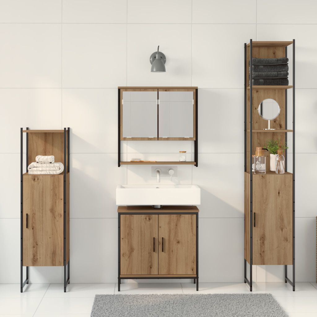 Ez a fürdőszoba bútor szett a praktikusságot modern érintéssel ötvözi, stílusos módot kínálva a fürdőszoba rendben tartására. A kézműves tölgyes befejezés meleg érzetet ad, így kedves kiegészítője lesz a beltéri helyiségeknek, míg a karcsú fekete fém keret friss jelleget hoz. A bőséges tárolás funkció rengeteg helyet biztosít piperecuccok, törölközők és egyéb cuccok számára, rendben tartva a fürdőszobádat. A modern dizájn egyedi érintést ad, melegséget és karaktert hoz a fürdőszobádba. Tartós anyagok biztosítják, hogy a bútor sokáig bírni fogja, így nem kell aggódnod a kopás miatt. Multi-funkciós funkciók lehetővé teszik, hogy minden egyes darabot különböző módokon használd, alkalmazkodva a tárolási igényeidhez és az elrendezési preferenciáidhoz. Egyszerű karbantartás, csak töröld le száraz ruhával, így könnyedén megőrizheted a bútorod szépségét.