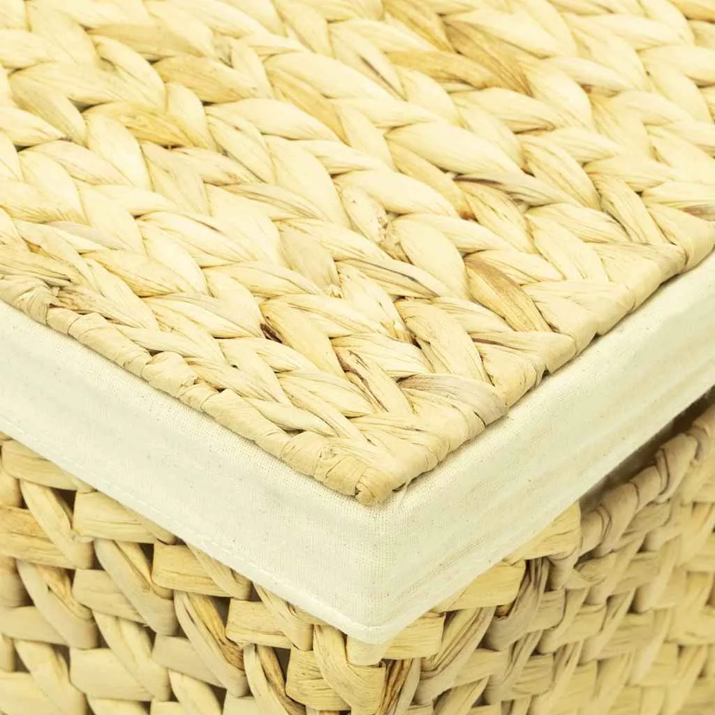 4-darabos, klasszikus és funkcionális kialakítású fürdőszobaszettünk nagyszerű kiegészítője lesz fürdőszobájának. Az erős vasvázzal rendelkező, vízijácintból készült szennyestartó, a négyszögletes kosarak és a szemeteskosár mind erős és tartós. A nagy rekeszek bőséges helyet biztosítanak a szennyesnek, a mindennapos rendszerezésnek és a szemétnek. A vonzó, fonott stílus rusztikus bájt kölcsönöz a szettnek. A szállítás 1 db szennyestartót, 2 db négyszögletes kosarat és 1 db szemetest tartalmaz.