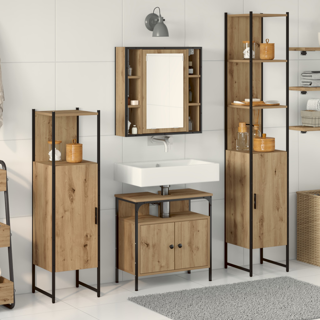 Ez a fürdőszoba bútor szett a stílus és a funkció királya, ügyesen megtervezve, hogy feldobja a teret. Minimalista dizájnja és kézműves tölgyes elemei bármely fürdőszobát feldobnak, miközben rengeteg tárolási lehetőséget biztosítanak, hogy minden rendben legyen. Tágas Polcok: A szett hat lebegő polccal van felszerelve, amik tökéletesek a tisztálkodószerekhez, díszekhez vagy napi cuccokhoz, így minden könnyen elérheted. Tartós Felépítés: Szerelt fából és forgácslapból készült, ez a bútor szett a stílust a tartóssággal ötvözi. Stílusos Tükör: Egy elegáns ezüst tükör nemcsak funkcionálisan segít, hanem vizuálisan is tágabbá teszi a teret, így remekül rásegít a szépségápolásra. Könnyű Rendszerezés: A zsanéros ajtók elrejtik a rendetlenséget, és rendezett kinézetet adnak, így a szett jól passzol a modern vagy minimalista stílushoz. Teljes Csomag: Mindezekkel a szükséges rögzítőkkel jön, így az összeszerelés simán megy a háztulajdonosoknak.