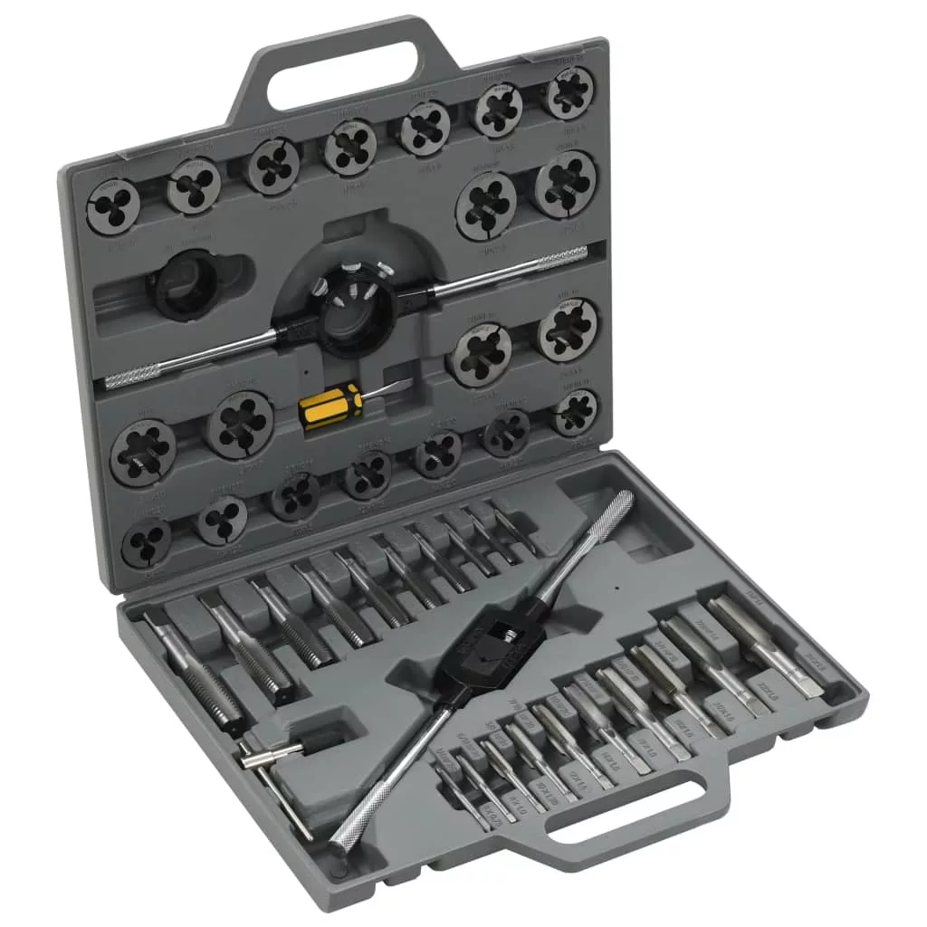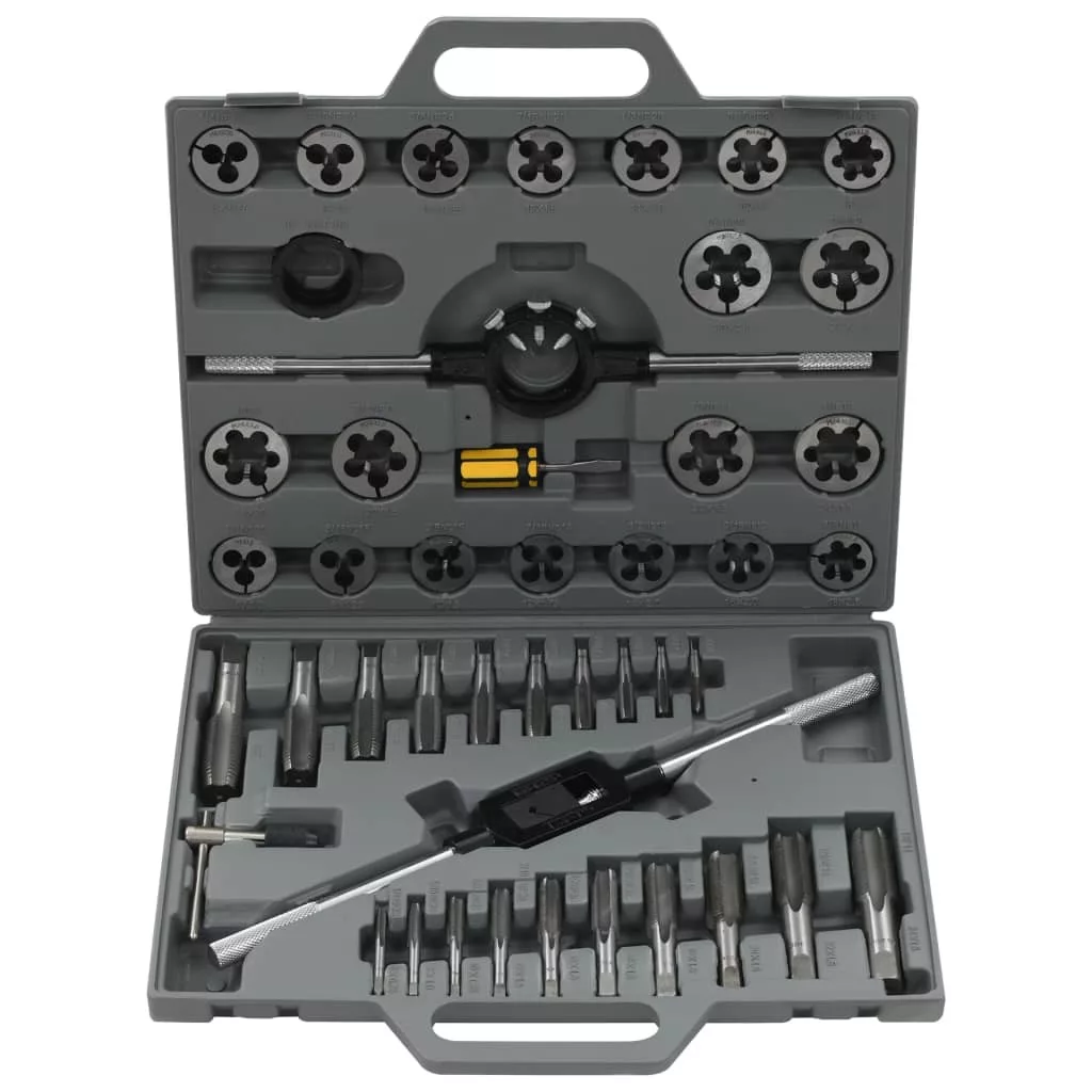 Ez a 45 darabos, praktikus menetmetsző és -fúró készlet, tökéletes lesz belső és külső meneteknek, és használható autóipari és általános mechanikai műhely használatra. Kiváló minőségű szénacélból készült. Az eszközök hő kezeltek és az erőre és tartósságra edzettek. A tartalmazott kényelmes hord táskának köszönhetően, ezek az eszközök szállítása egyszerű és nem vesz igénybe túl sok helyet. A szállítás tartalmaz 1 x 50 mm-es menetfúró kulcsot, 1 x menetfúró kulcs M6-M25, 1 x T-nyelű menetvágót, 1 csavarhúzót, 1 menetfúró tartót, 20 x menetvágó fejet és 20 x menetfúró hegyet.