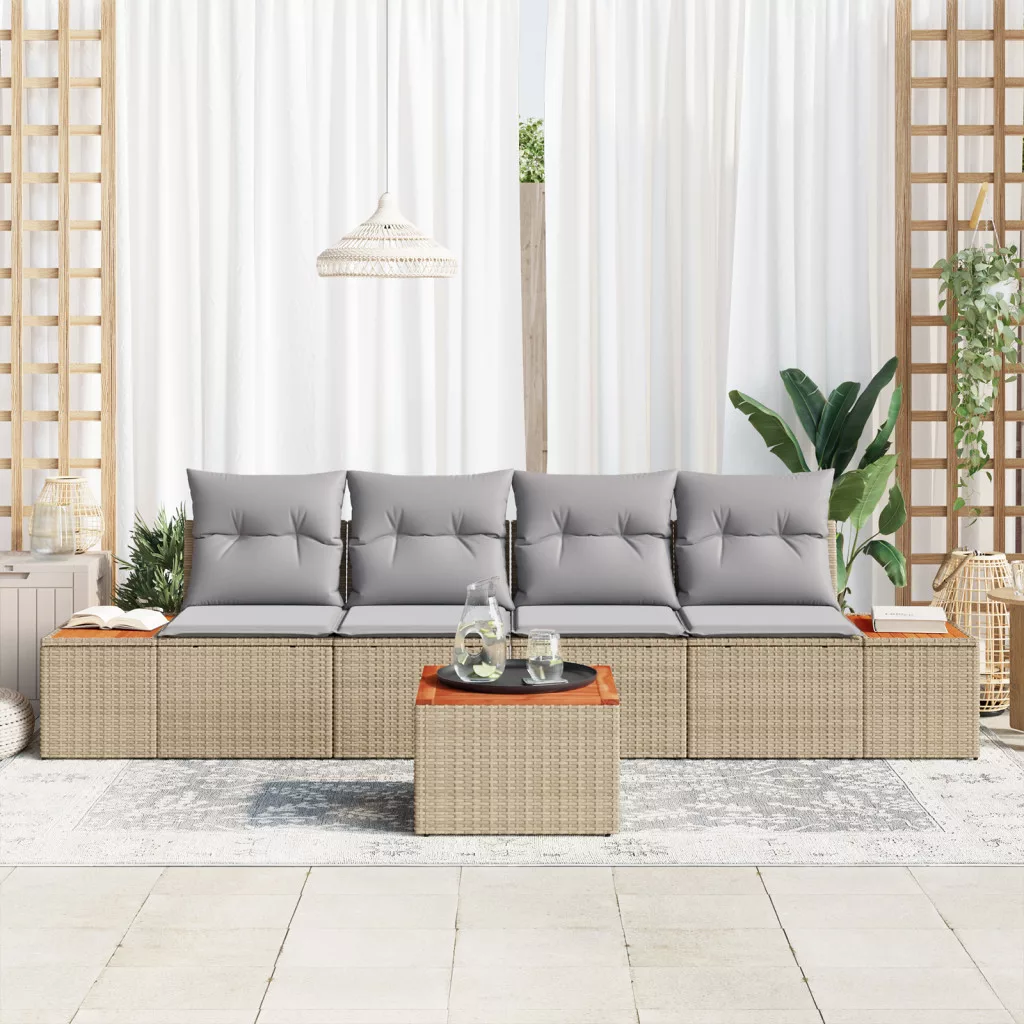5 Rész Kerti Kanapé Szett Párnákkal Bézs Poli Rattan Akáciából