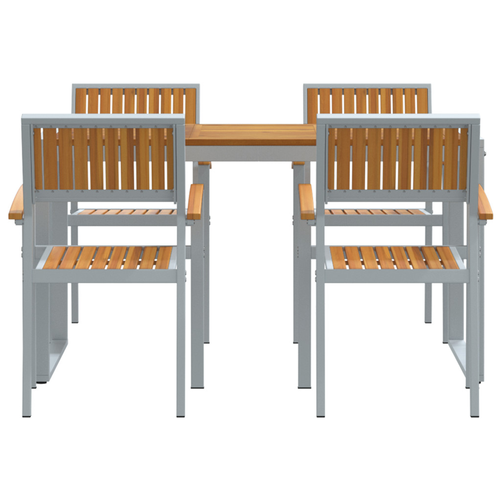 Ez az 5 részes kerti étkező szett praktikus és stílusos, így nagyszerű kiegészítője lesz bármely erkélynek vagy terasznak. Tömörfából és fémből készült, ez a szett laza hangulatot teremt a kültéri étkezésekhez és összejövetelekhez, melegséget hoz, miközben akár négy embert is elfér. Kifinomult modern felület: Ez az étkező szett csillogó megjelenésű, a lenyűgöző szürke és természetes fa kombinációval, ami feldobja a kültéri étkezést. A sima felület elegáns, mégis praktikus érintést ad a mindennapi használathoz. Robusztus szerkezet: A tömör fából és alumíniumból készült mix a szilárd építést jelenti, ami kezelni tudja az időjárás változásait, miközben megőrzi a szuper megjelenést. Ez a tartósság meghosszabbítja kültéri bútoraink élettartamát, biztosítva, hogy sokáig bírja. Kényelem a középpontban: Minden szék lapos kartámaszú és tágas üléssel bír, szilárd támaszt nyújtva a kültéri étkezések alatt. Élvezd a kényelmes étkezést ezekben a jól megtervezett székekben. Kényelmes karbantartási útmutató: Ezt az étkező szettet könnyű tisztán tartani egyszerű takarítási lépésekkel. Csak töröld le meleg vízzel, és kerüld a kemikáliák használatát, hogy megőrizd szuper állapotát tovább. Tökéletes méret a találkozókhoz: A négyszögletes asztal 140 x 80 cm, rengeteg helyet kínál étkezésekhez, lehetővé téve a szórakoztatást anélkül, hogy zsúfoltnak éreznéd magad. Ideális kis családi összejövetelekhez vagy laza kültéri vacsorákhoz.