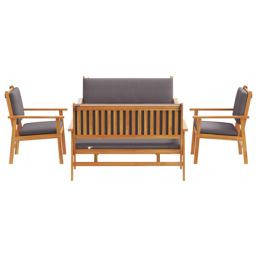 Ez a menő akácfa kerti bútor szett egy szuper mix padokból, székekből és egy kávézóasztalból áll, kellemes kültéri teret teremtve a találkozókhoz. A természetes fa felülettel és divatos dizájnnal ez a szett modern, de rusztikus hangulatot ad a kertednek, erkélyednek vagy télikertednek, tökéletes a stílusos pihenéshez. Természetes anyag: Tömör akácfából készült, természetes olajjal kezelve, ez a bútor szett gyönyörű sima felületet biztosít, kiemelve a fa erezetét, miközben strapabíró kültéri használatra. Kényelmes párnák: Minden üléshez puha, 100% poliészter párnák tartoznak, maximális kényelemért, legyen szó lazításról vagy étkezésről, fokozva a kültéri szórakozásodat. Sokoldalú stílus: A szett tiszta vonalai és semleges tónusai illeszkednek a különféle dekorációs stílusokhoz, tökéletes találkozókhoz, étkezésekhez vagy kávézásokhoz a szabadban. Tartósság: Az elemekkel szembeni ellenálló felépítés az UV-álló felület megvédi a bútorodat a harsh napfénytől, biztosítva, hogy az évről évre is szép és funkcionális maradjon. Generál méret: A szett kényelmesen elfér hat embernek, így ideális családi grillezésekhez vagy kertipartikhoz, miközben rengeteg helyet biztosít a kültéri tér élvezetéhez.
