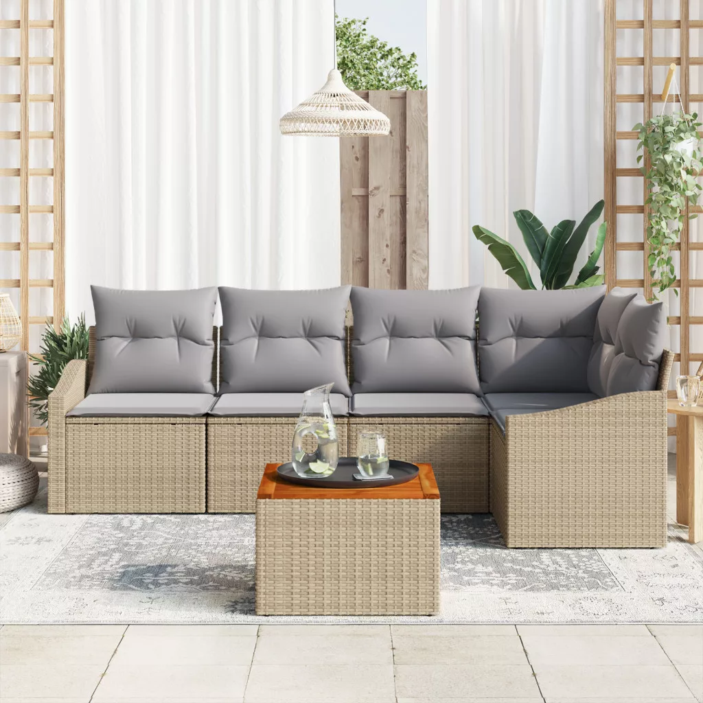 6 Darab Kert Kanapé Szett Párnákkal Bézs Poli Rattan Akácia