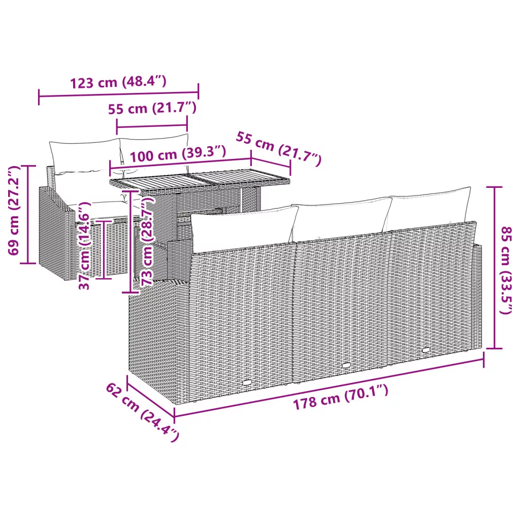 Kézbesítés tartalma: 4 x Karfa nélküli kanapé tárolóval, 1 x Középső ülés tárolóval, 1 x Kerti asztal