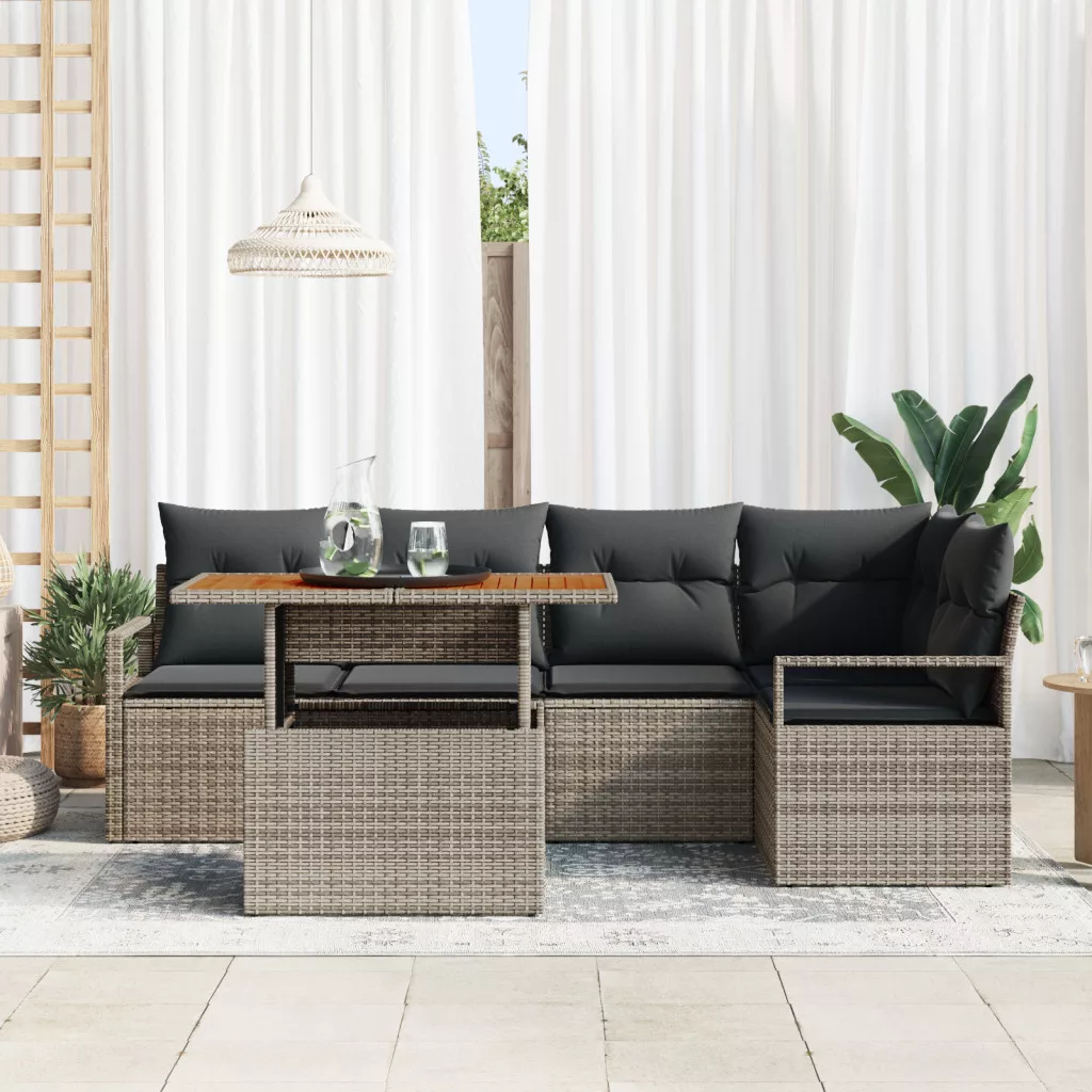 6 Részes Kert Szófa Szett Párnákkal Szürke Poli Rattan Akác