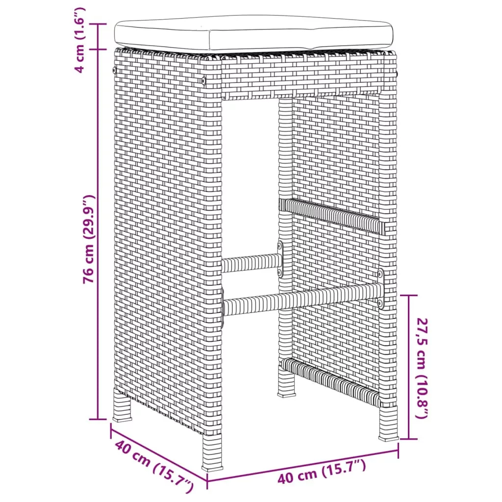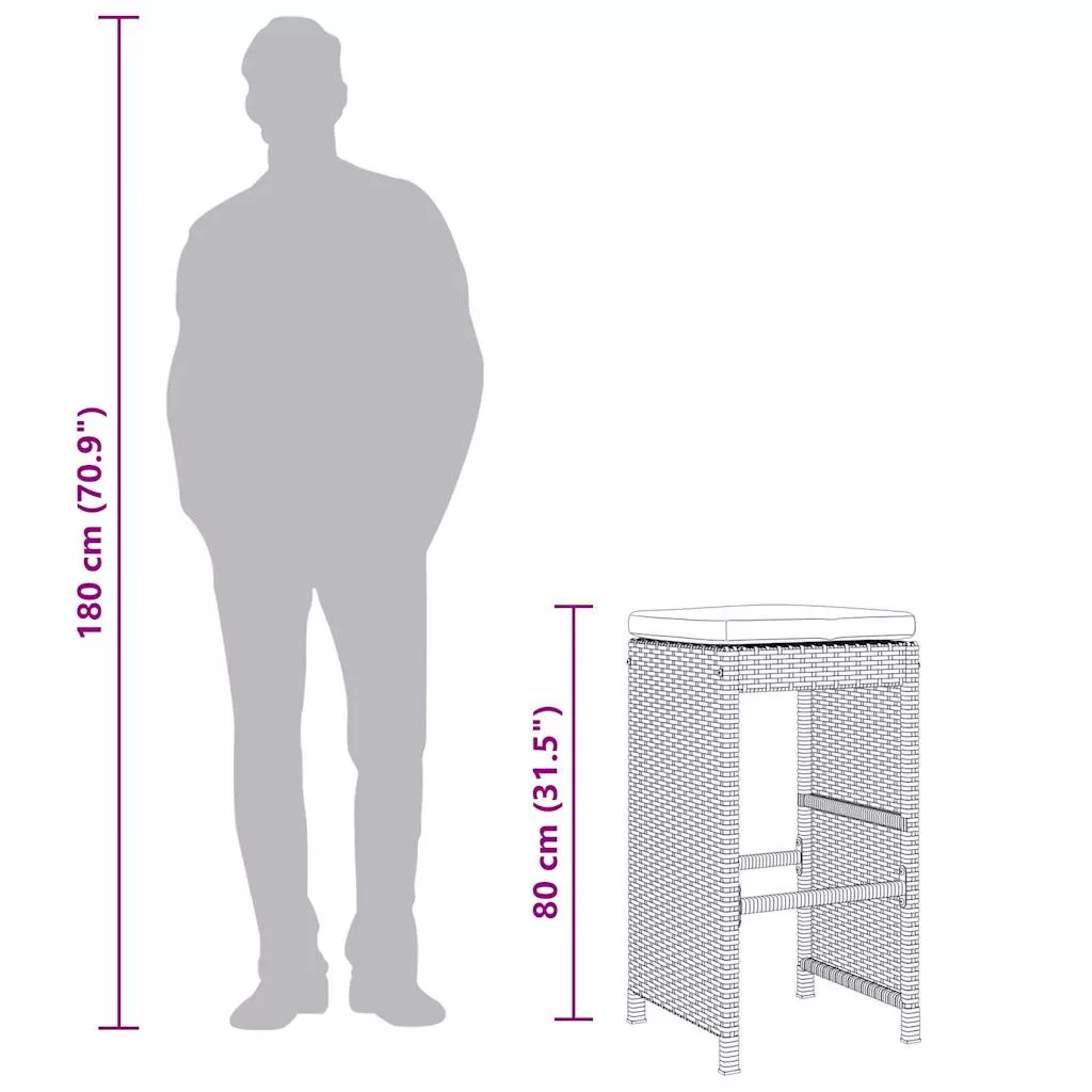 Pihenjen és élvezze a szabad levegőt ezeken a kényelmes kerti bárszékeken! Tartós anyag: A PE rattan, más néven polyrattan, egy erős, kevés karbantartást igénylő szintetikus anyag, amely úgy néz ki, mint a természetes rattan. Könnyű, könnyen tisztítható, tartóssága és időjárásálló tulajdonságai miatt gyakran használják kültéri bútorok készítéséhez.Kényelmes ülőélmény: Ez a vastagon bélelt párnákkal kiegészített kültéri bútor kényelmes ülőélményt kínál.Levehető és mosható huzat: Ezek az ülőpárnák levehető huzattal rendelkeznek az egyszerű mosás és karbantartás érdekében. Robusztus és stabil váz: A porszórt acél váz biztosítja, hogy a kerti bútor erős és stabil legyen a mindennapi kültéri használathoz. Jó tudni:A kültéri bútor szépségének megőrzése érdekében javasoljuk, hogy vízálló huzattal fedje be. Maximum 110 kg ülésenként.
