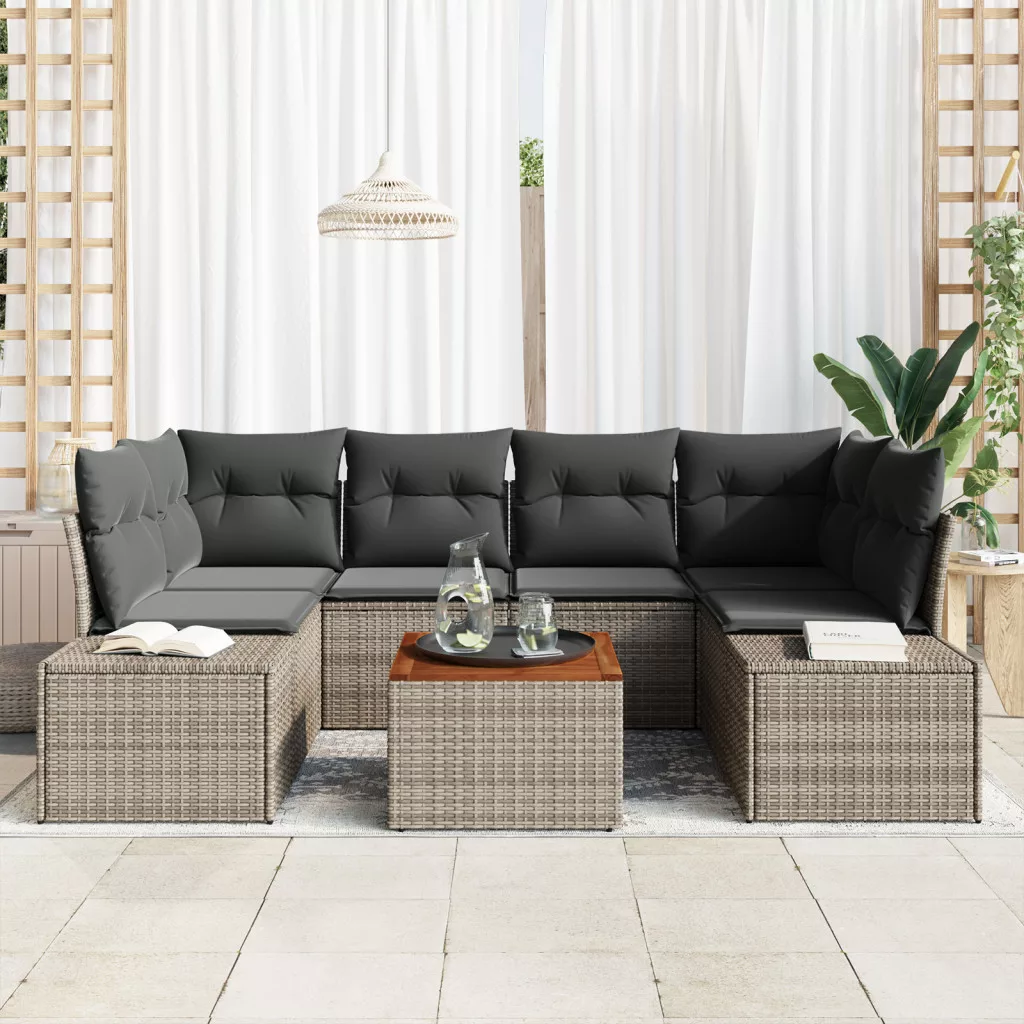 7 Részes Kertbútor Szett Párnákkal Szürke Polirattan Akáccal