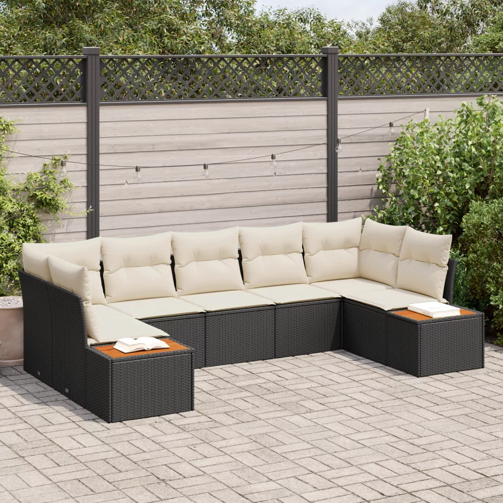 7 Részes Kerti Kanapékészlet Párnákkal Fekete Poli Rattan Akác