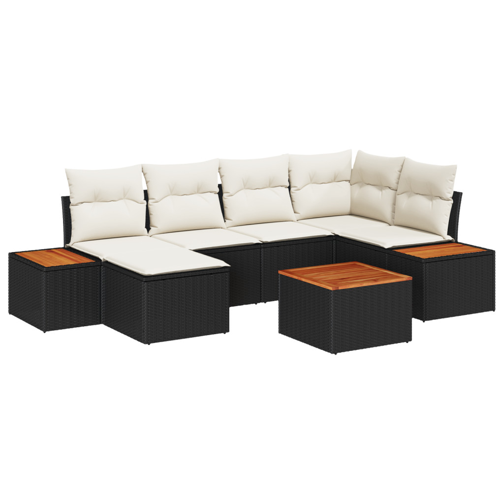 7 Részes Kerti Kanapesz Készlet Párnákkal Fekete Polirattan Akáccsal
