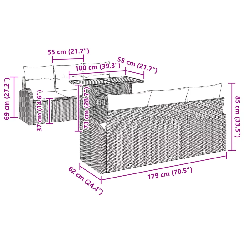 Kézbesítés tartalma: 4 x Karos kanapék tárolóval, 2 x Középső ülés tárolóval, 1 x Kerti asztal