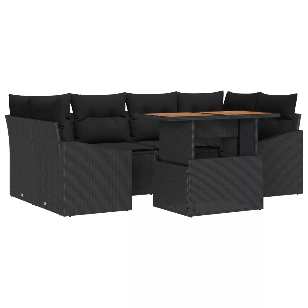 7 darabos kert étkező szett párnákkal fekete poli rattan akácia