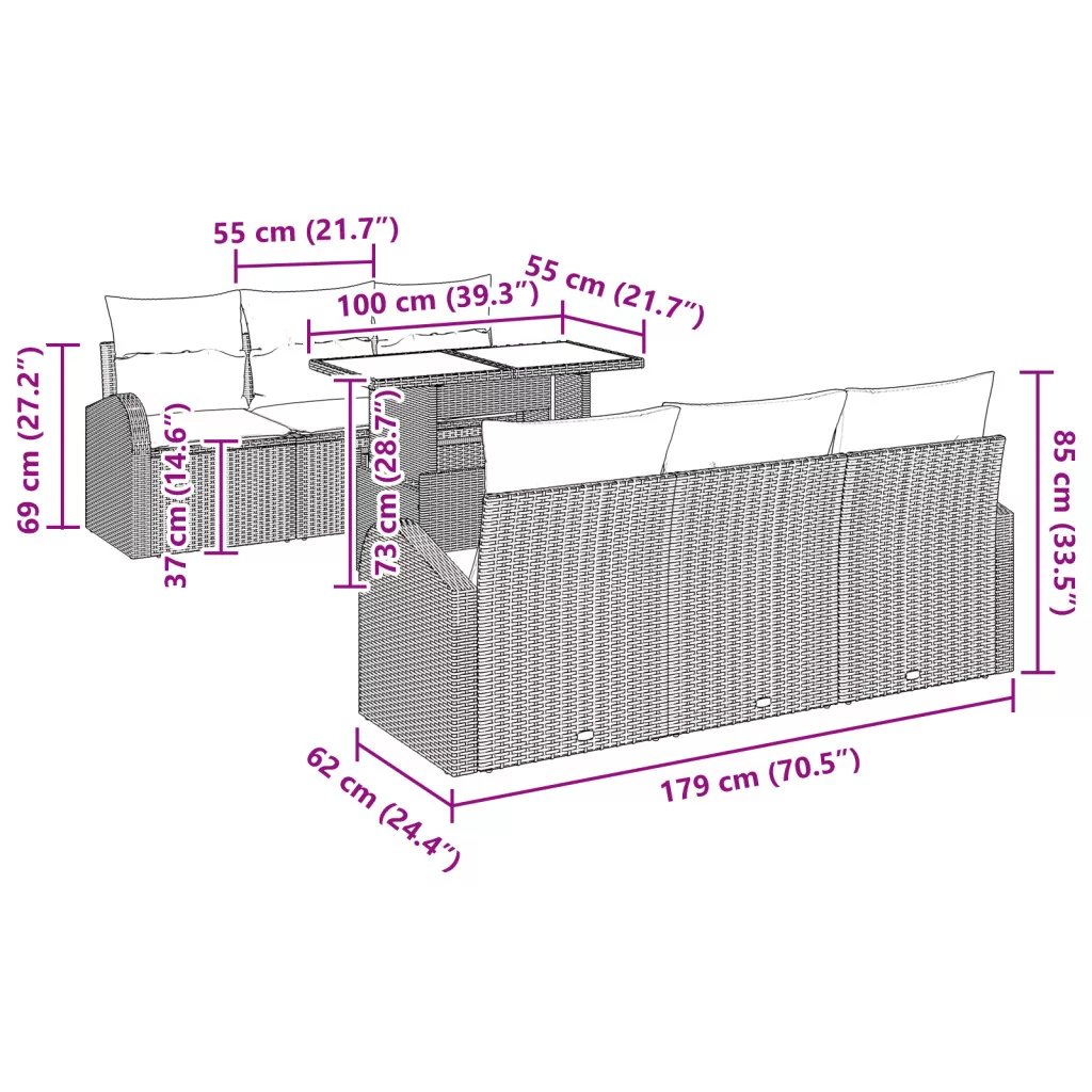 Ez a 7 részes kert kanapé szett szilárd, szintetikus poli rattanból készült, és egy luxus, kényelmes kültéri élményt kínál. A sötét barna megjelenése és fekete kiegészítői teszik a teraszok, kertek vagy erkélyek szuper középpontjává, biztosítva a kényelmes ülőhelyet összejövetelekhez vagy éppen csak a lazításhoz. Stílusos dizájn: Ez a kert kanapé szett modern kinézetével kortárs hangulatot biztosít bármely kültéri térnek. A színek eleganciát sugároznak a pihenéshez. Kényelmes ülőhely: Az időjárásálló habbal és poliészter szövettel bevont párnázott ülőhelyek luxus kényelmet nyújtanak, minden kültéri időt élvezhetővé téve, legyen szó barátok szórakoztatásáról vagy egy könyv olvasásáról. Rendkívüli tartósság: UV- és vízálló anyagokból készült, ez a kanapé szett bírja a különböző időjárási viszonyokat, biztosítva, hogy átélje az évszakokat és jól nézzen ki. Rugalmas felhasználás: Nagyszerű mindenféle kültéri tevékenységhez, az intim vacsoráktól a laza családi összejövetelekig. A moduláris dizájn lehetővé teszi a különböző ülőelrendezések beállítását, tökéletesen illeszkedve a helyedhez és a alkalmakhoz. Bőséges dimenziók: Generózusan kialakítva, hogy kényelmesen elférjen hat ember, az összmérete biztosítja a kényelmet, miközben praktikus a kültéri használatnál, így elengedhetetlen része bármelyik kertnek vagy terasznak.