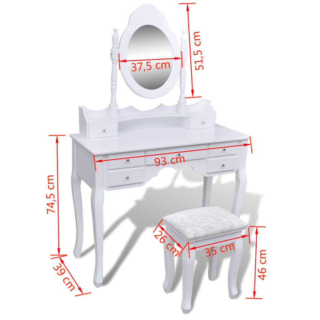 Ez az elragadó, XXL méretű fésülködő asztal és zsámoly szett kiváló minőségű fenyőfából készült. Viktoriánus stílusa és tiszta fehér felülete eleganciát és szépséget csempész budoárjába vagy öltözőjébe. Egyedülálló kézművesmunka terméke, mely tovább növeli az asztal és zsámoly szett szépségét. Az asztali tükör szabadon álló kerettel lett ellátva, így a kívánt szögbe állítható. Meglepő módon a tükörkeret és az asztal külön is használható. Hét elegáns fiókja további helyet biztosít ékei, kozmetikumai és egyéb személyes holmijai számára. Ez a fésülködőasztal és zsámoly szett bárhová is kerül, magára vonzza a tekinteteket. Könnyen összeszerelhető a mellékelt szerelési tartozékokkal.