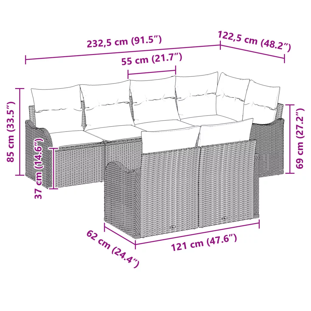 Ez a 7 részes moduláris kerti kanapé szett a kényelmet és a stílust hozza el a kültéri területedre. Tökéletes teraszokra vagy télikertekhez a stílusos megjelenésével és időjárásálló anyagaival, amitől mindkét világ legjobbját kínálja, így a barátaid is kényelmesen pihenhetnek. A moduláris dizájn számtalan módon összeállítható, tökéletesen illeszkedik bármilyen térhez vagy parti hangulathoz. Ez a rugalmasság nagyszerűvé teszi laza összejövetelekhez és elegáns estélyekhez egyaránt. A vastag, puha habbal töltött párnák hosszú órák pihenését kínálják. A párnák zipzárasak, így könnyen levehetők a tisztításhoz, megkönnyítve a karbantartást. UV-álló szintetikus polirattanból készült, ez a kerti kanapé szett bírja a közvetlen napsugárzást, miközben évszakról évszakra megőrzi élénk színeit. A tartós anyagok garantálják, hogy a kültéri ülőhelyed mindig jól nézzen ki bármilyen időjárásban. A modern dizájn illik bármilyen kültéri dekorációhoz, barátságos légkört teremtve. Tiszta vonalak és texturált befejezés feldobják a kertet vagy erkélyt, örömet szerezve vendégeidnek, és gazdagítva otthonod külsejét. A komfortos ülést 5 ember számára biztosítja, amely tökéletes családi kiruccanásokhoz, laza grillezésekhez, vagy csak csendes estéken a csillagok alatt való szórakozáshoz. Élvezd a kültéri életet a családoddal vagy a barátaiddal!