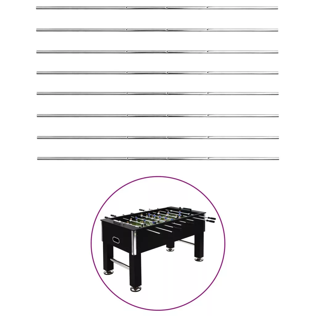 Ez a 8 darabos csocsóasztal acélrúd szett elegendő ahhoz, hogy felszereljen vele egy hagyományos csocsóasztalt. Ideális a kopott vagy gyengébb minőségű rudak cseréjéhez az élvezetesebb játékélmény érdekében. Acélból készültek a rudak, így rendkívül strapabíróak és tartósak. A felület krómozott kivitelű. Kérjük vegye figyelembe, hogy a fogantyúk és a rögzítők nem tartoznak a szállítmányhoz. Figyelem. 3 év alatti gyermekek számára nem alkalmas. Kis alkatrészek. Fulladást okozhat.