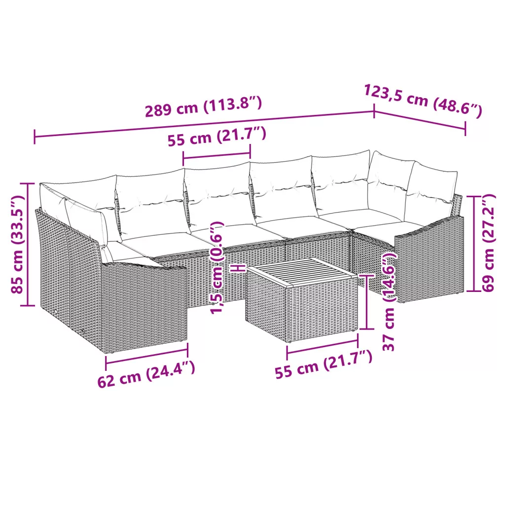 Szállítás tartalmazza: 3 x középső ülés tároló funkcióval, 2 x sarok ülés tároló funkcióval, 2 x karfás kanapé tároló funkcióval, 1 x kerti asztal