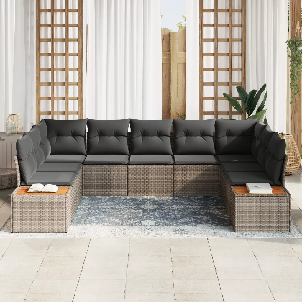 9 Darabos Kerti Dívány Szett Párnákkal Szürke Poly Rattan és Akác Fából.