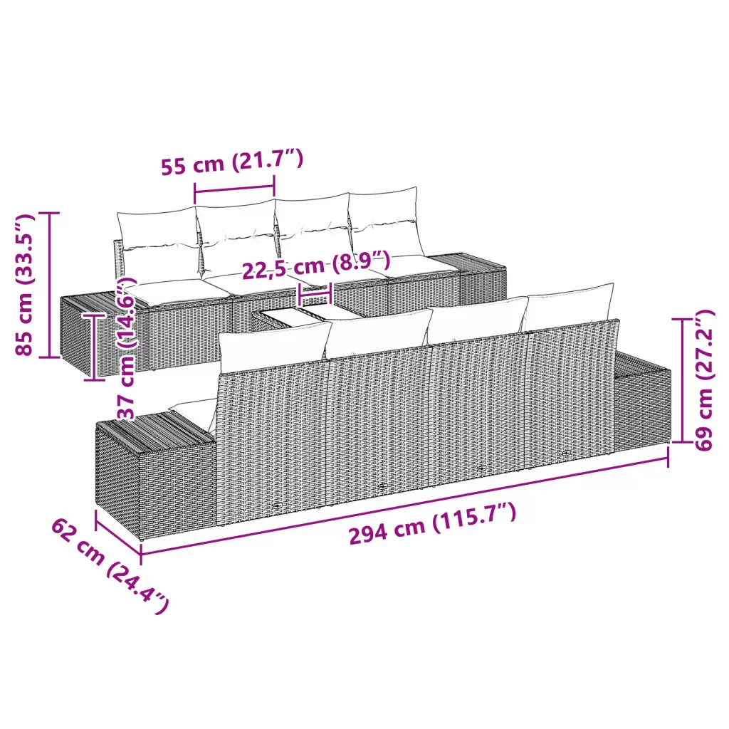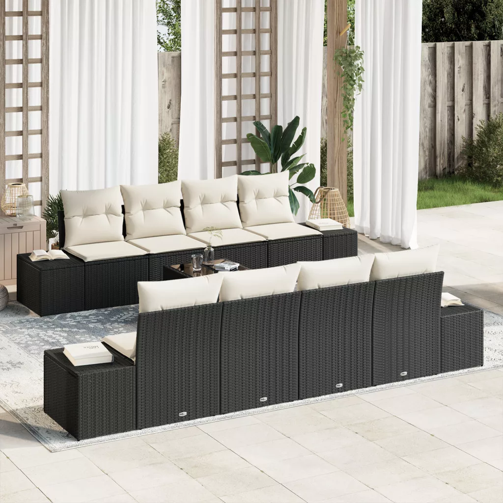 Ez a 9 részes kerti kanapékészlet modern dizájnnal és egy csipetnyi eleganciával bármilyen helyet feldob. Kiváló egy kényelmes kültéri összejövetelhez vagy a benti pihenőhelyek felfrissítéséhez. A puha krém párnák és a tartós poli rattan keret hívogató és praktikus ülőhelyet nyújt, ideális családi összejövetelekhez vagy barátok szórakoztatásához. Sokoldalú design: Ez a kanapékészlet ugyanolyan jól működik benti és kinti környezetben, így a legjobb választás a nappalikhoz, teraszokhoz vagy erkélyekhez, egyesítve a kényelmet és a stílust. Az elrendezésed a különböző alkalmakra gyerekjáték! Kényelmes párnák: Minden ülés puha és levehető huzatokkal van ellátva, így kényelmesen relaxálhatsz és könnyen tisztíthatod is. A habbal töltött párnák csodásan néznek ki, remekek a napsütéses délutánokhoz. Időjárásálló: Tartós poli rattanból és szilárd porszórt acél keretből készült, ez a szett jól bírja a különböző időjárási körülményeket. Az anyagok biztosítják, hogy ez a stílusos készlet hosszú időn kitart. Bőséges ülőhely: Hat főnek bőséges helyet adva, ez a szett ideális családi eseményekhez. Erdei kényelmet és interaktív társasági élményeket garantál. Könnyen karbantartható: A levehető párnahuzatok és időjárásálló anyagok megkönnyítik a tisztítást, így a szabad tered élvezetére koncentrálhatsz. Csak töröld le a felületeket, és hozd be a párnákat, ha csúnya idő van.
