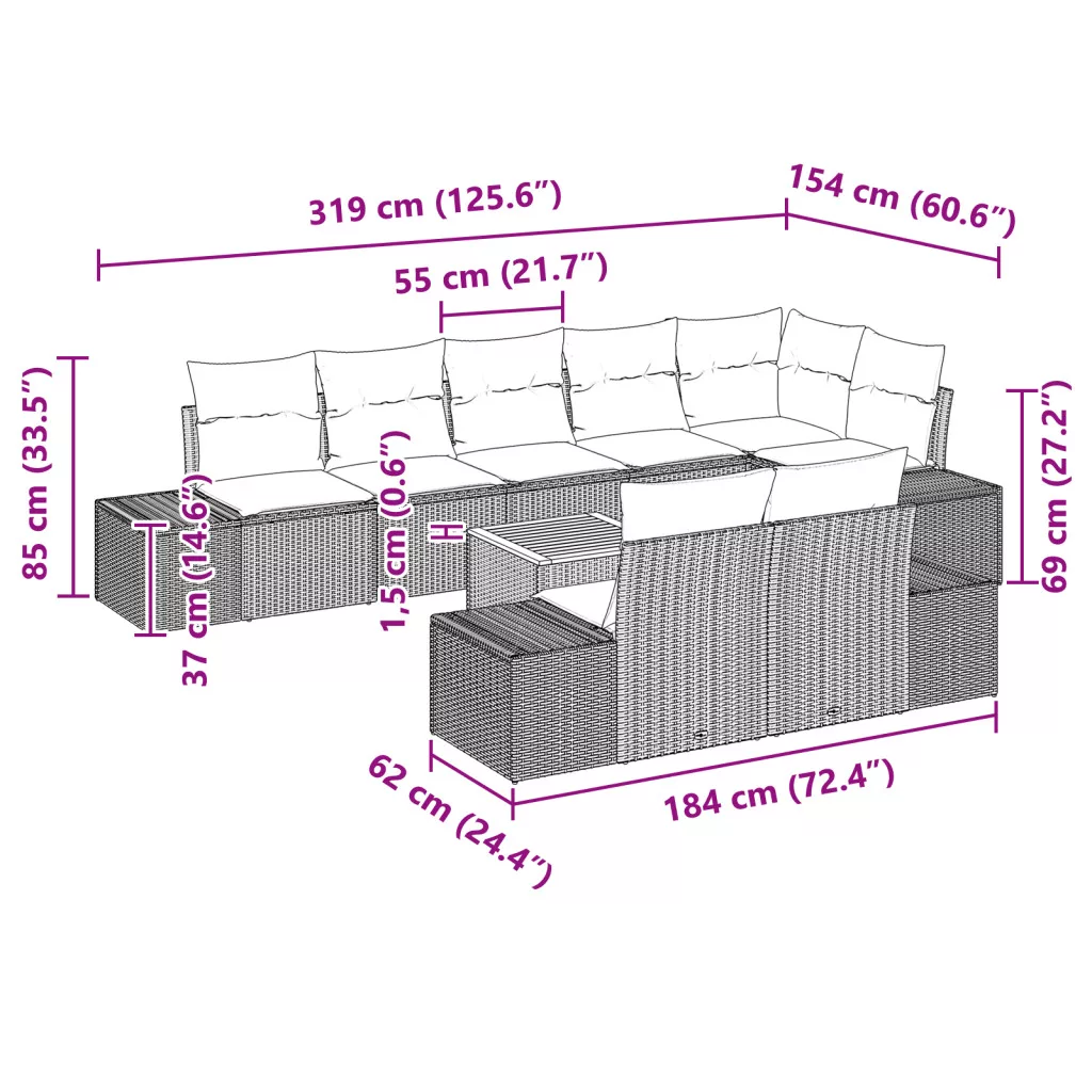 Ez a kertbútor készlet tökéletes választás a kültéri teredhez, mind a kényelmet, mind a stílust hozza, legyen szó parti szervezéséről vagy csak lazításról. Elegáns dizájnjával és bézs polirattan és krém párnák kombinációjával modern érintést ad, közben elég tartós a napi használathoz. Ez a praktikus ülőhely felfrissíti a kertedet, teraszodat vagy erkélyedet, és az időjárás viszontagságait is elbírja, tökéletes a napfényes tavaszi és nyári napokra. Moduláris design: Az elrendezést úgy alakíthatod, ahogy csak szeretnéd, így mindig kényelmes lesz bármilyen összejövetelhez, legyen az egy nyári grillparti vagy egy pihentető este. Kényelmes ülőhely: Minden párna puha töltete garantálja, hogy órákon át lazíthass. Ezenkívül a párnázott karfák még jobban fokozzák a kényelmet. Tartós anyagok: Magas minőségű polirattanból és poliészterből készült, ez a kanapé bírja az időjárást, így hosszú ideig szuperül néz ki. UV-álló is, megvéd a nap káros hatásaitól, így bátran kinn maradhat anélkül, hogy kifakulna. Könnyű karbantartás: A levehető párnahuzatok tisztítása szuper egyszerű, így könnyen megőrizheted a friss állapotát. Ez a praktikus funkció elengedhetetlen a kültéri bútorokhoz, segít rendben tartani a teret. Bőséges ülőkapacitás: Kilenc fő számára elegendő hellyel ez a készlet ideális családi együttlétekhez, bulikhoz vagy csak barátokkal való lazításhoz. Terjedelmes dizájnja népszerű helyszínné teszi a kültéri szórakozáshoz.